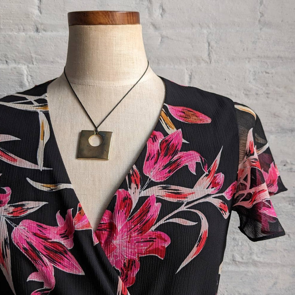 Retails $480. Loving this sexy flowy take on the classic little black dress! Absolutely gorgeous oversize all over vibrant floral print in bold pinks, reds and cream on black. Sheer flowy tulip sleeves, flattering high waistline, cinching wrap around o-ring waist. Flowy wrap silhouette, super soft, fully lined, a touch sheer. Longline flared maxi style with excellent drape. Gently used, in excellent condition.