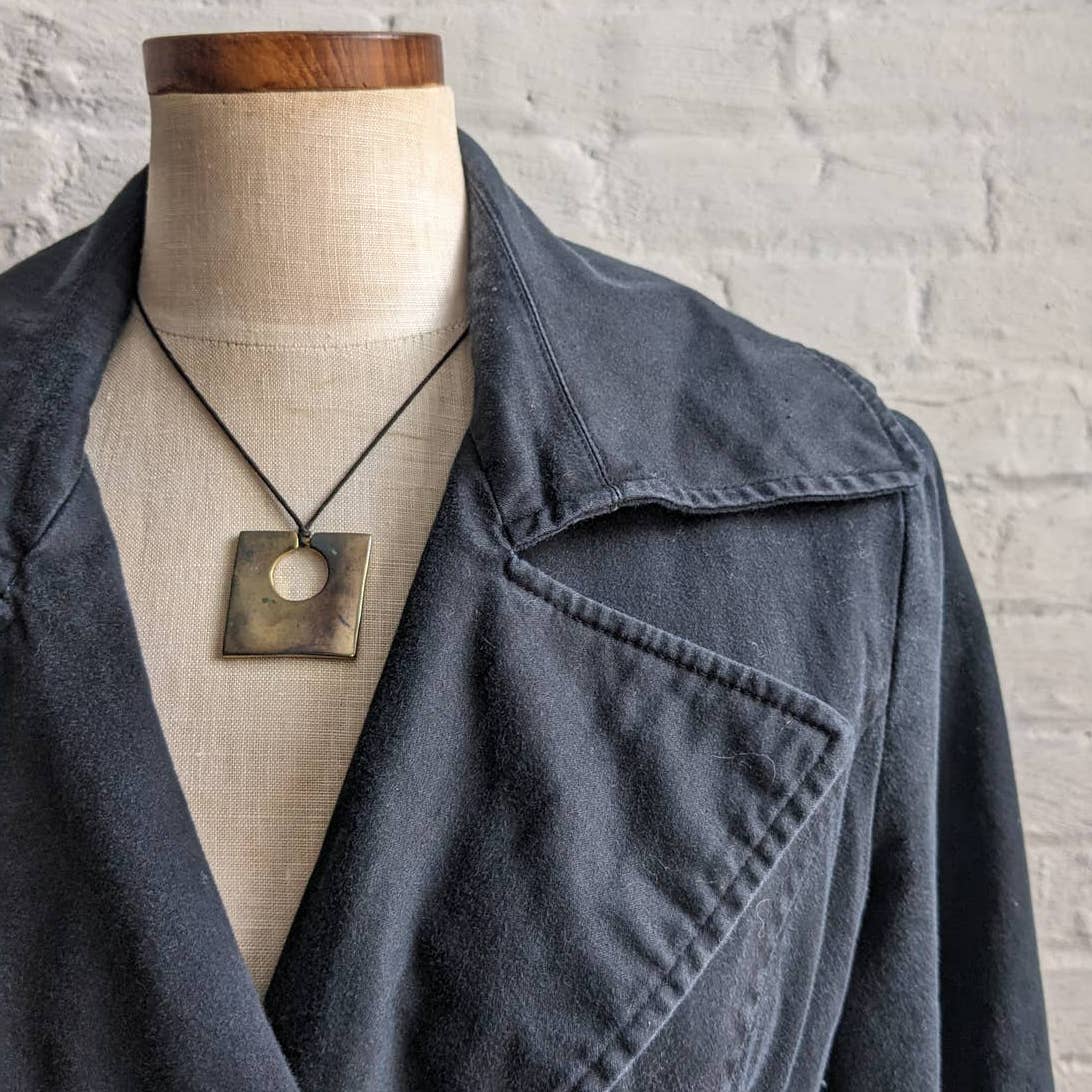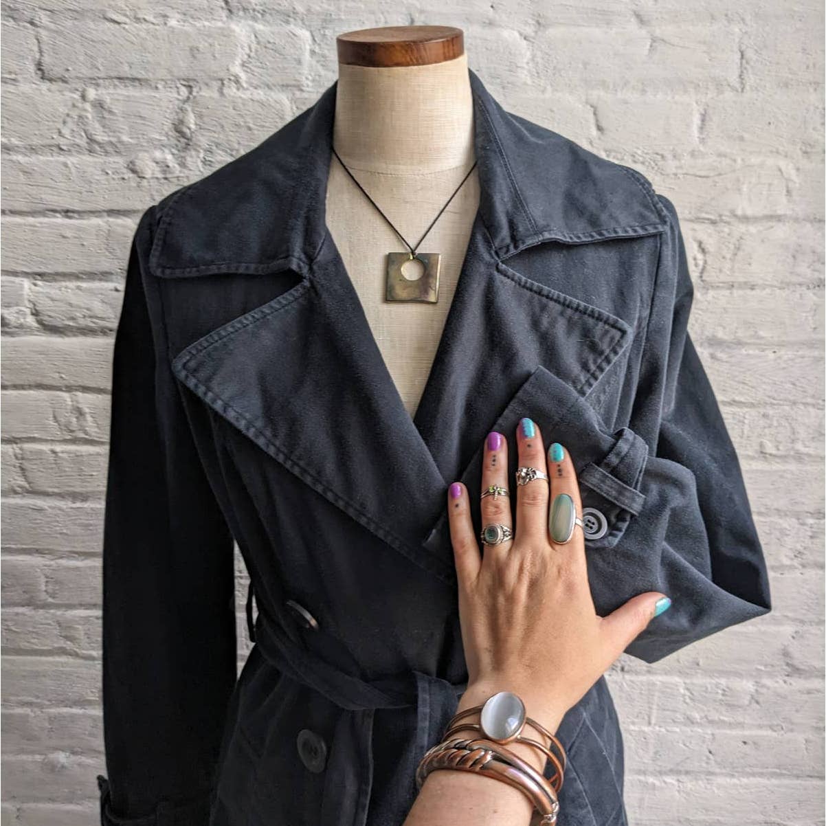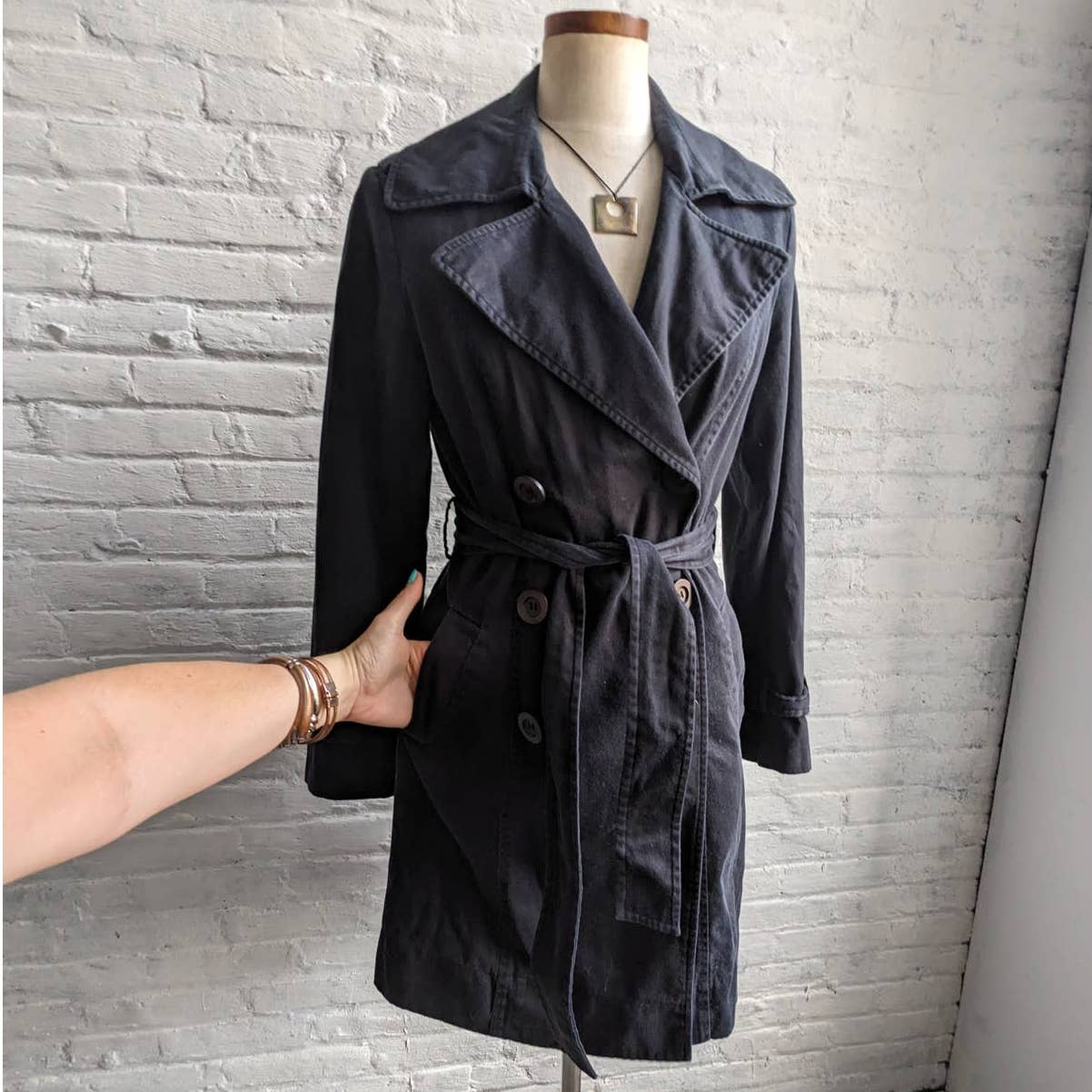 Muted matte black with faded navy undertones. Double breasted button front closure, belted waist, double dagger collar. Buttoned cuffs. Soft and breathable cotton. Long line silhouette. This is a light to mid-weight trench coat.