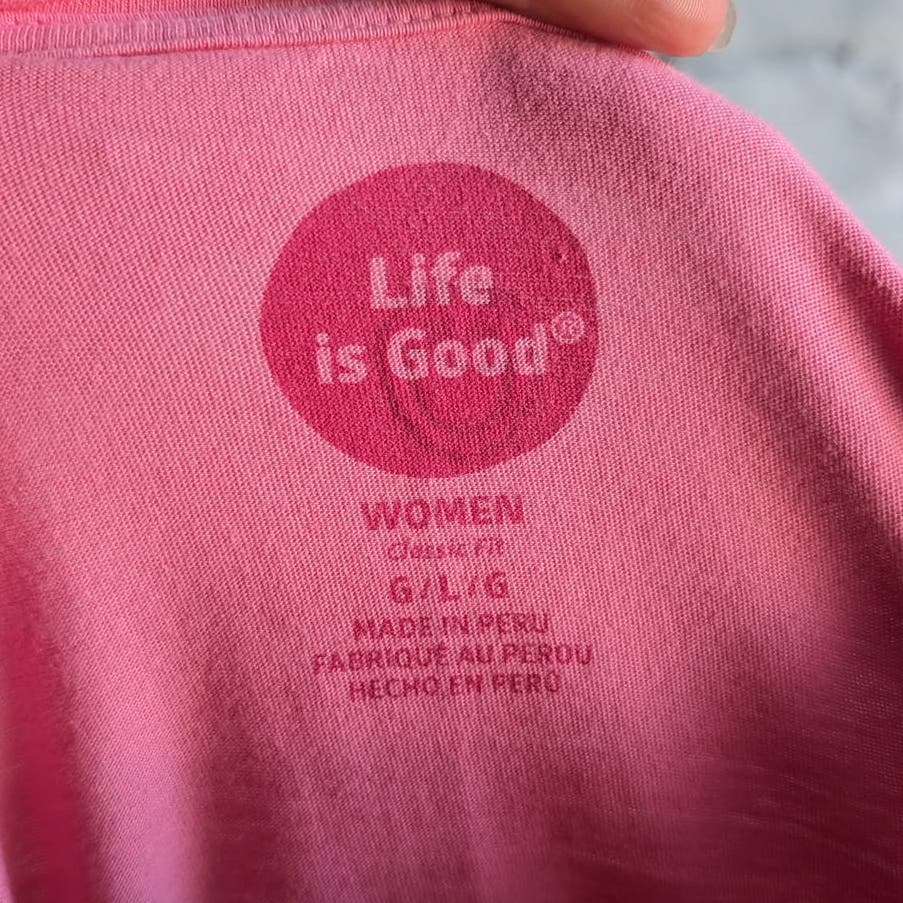 Love this rad little retro vacay vibe tropical print tee. Vibrant Barbie pink colorway with earthy warm tone sunset & palm trees design. Y2K skater beach babe meets 80s island coconut girl. Life is Good + Spread Good Vibes spellout in oversize groovy bubble script. Smiley face logo on center upper back. Super soft faded print with barely there feel. Longline silhouette, relaxed fit. Lightweight breezy feel, perfect for spring layers. Gently used, in excellent condition.