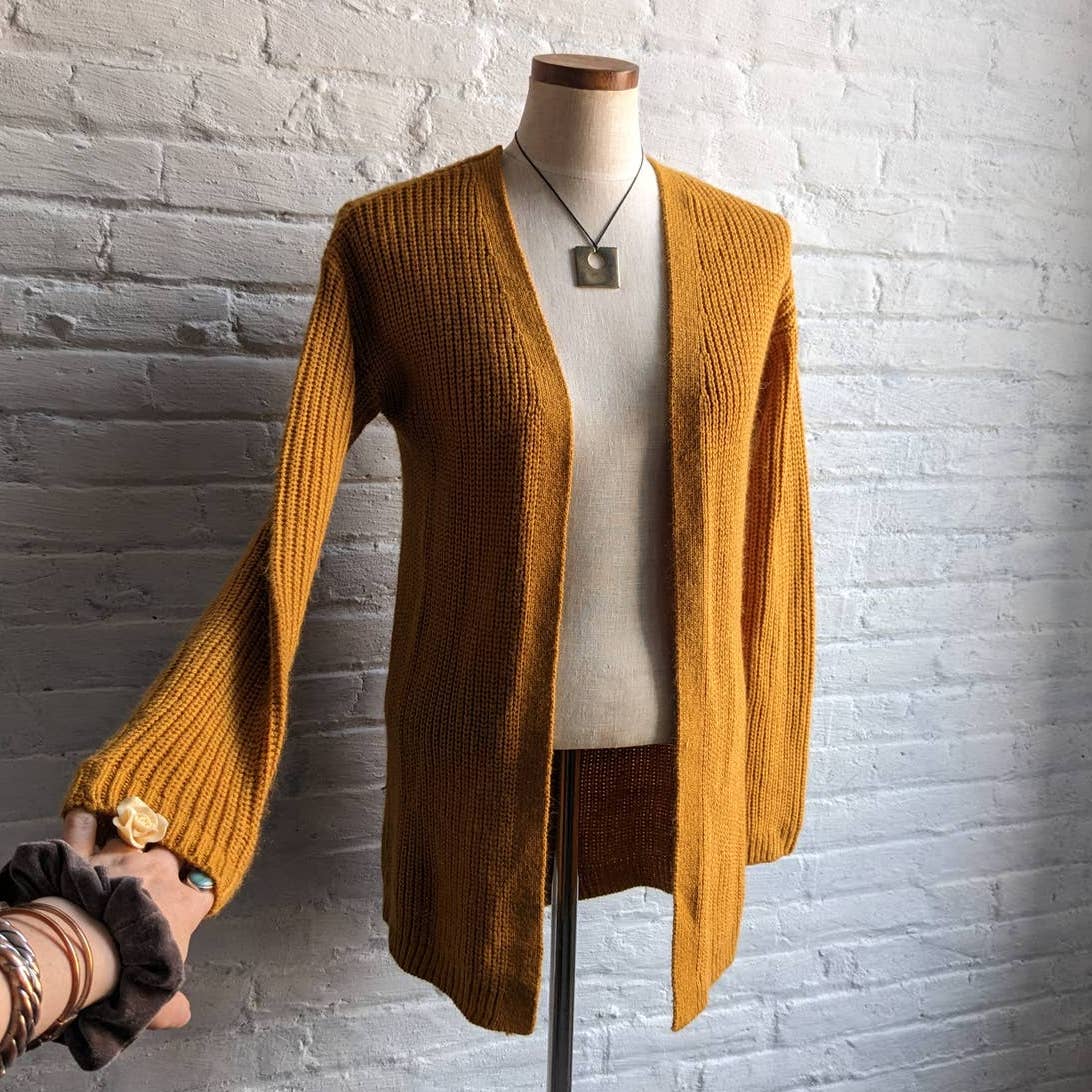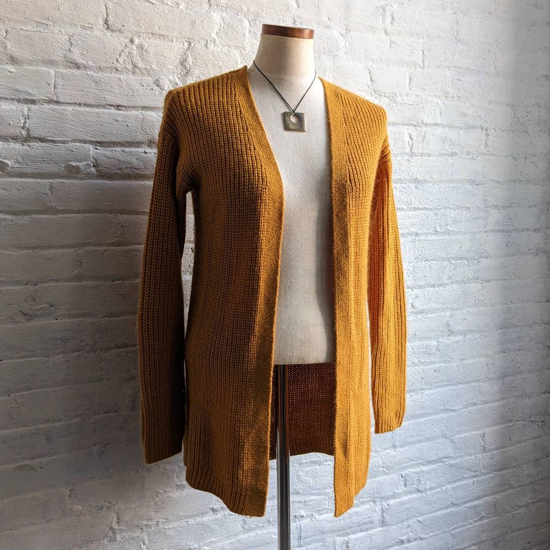Super cute little chunky knit cardigan in a gorgeous rich fuzzed out mustard yellow orange. Rad chunky lace up detail all down the back. Super soft with good stretchy and sooo comfy. Longline silhouette, clean and minimal look. Open front design can fit a range of sizes. Minor pilling. Gently used, in excellent condition.