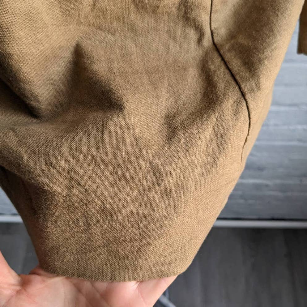 Dope little shacket with gorgeous beaded embroidery and southwest vibes for days. Super soft linen blend in earthtone muted brown. Stripes and geometric designs with pops of yellow and white stripes. Open front design fits a range of sizes. Light to mid-weight blazer, perfect for layers.
