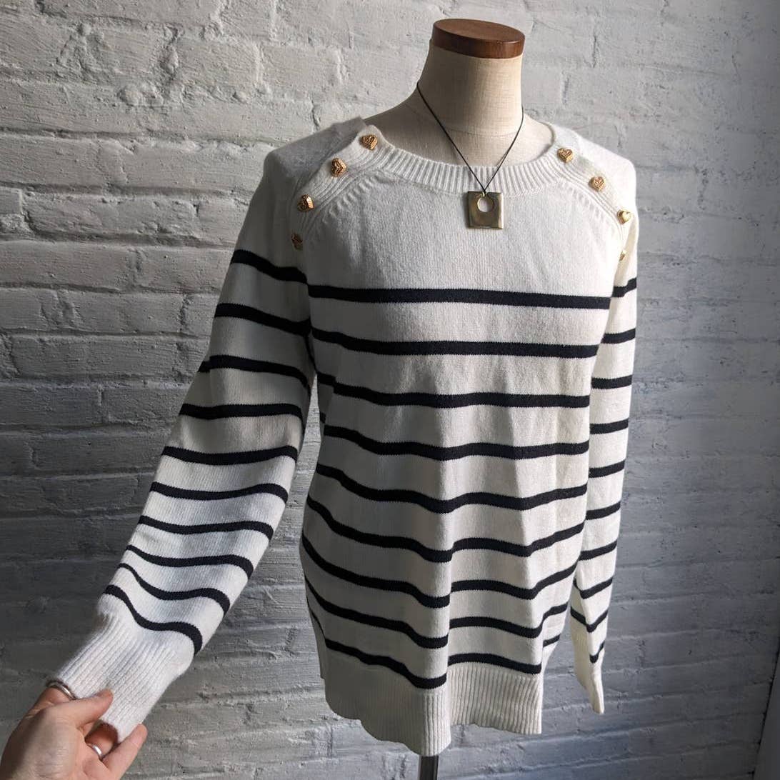 Super cute romantic coastal grandma vibes! Soft and cozy classic striped knit sweater in off white and black. The most quaint little golden heart buttons adorn each shoulder. Stretchy light to mid-weight feel with longline silhouette. Oversize cozy fit. Perfect belted as a mini sweater dress or unbuttoned for a slouchy cold shoulder look. Gently used, in excellent condition.