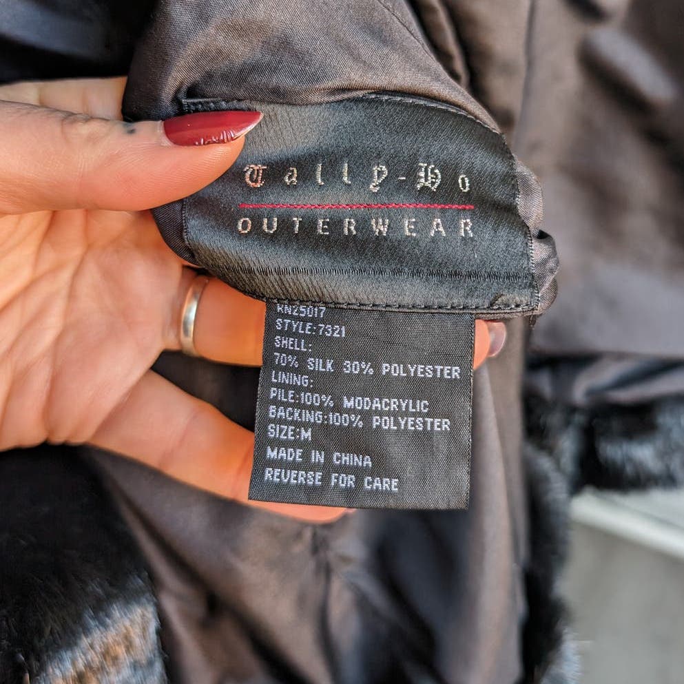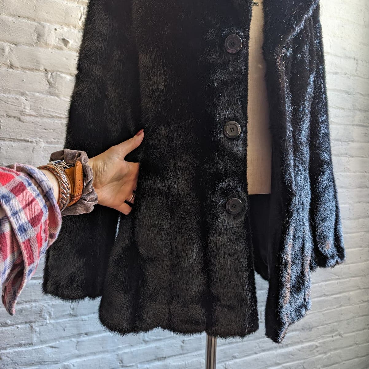 LOVE! Fully reversible shaggy faux fur to silk with peeks of fur accents. Major 70s almost famous rock star girlfriend does minimalist mob wife chic vibes. Silky soft jet black faux mink. Plush lux oversize collar, subtle flared bottom lettuce hem. Matte black silk on the inside. Cozy warm, longline silhouette. Slouchy oversize fit. Button front, pockets on both fur and silk sides. Mid-weight perfect for layers. Hits mid thigh on 5'4 model. Gently used, in excellent condition.