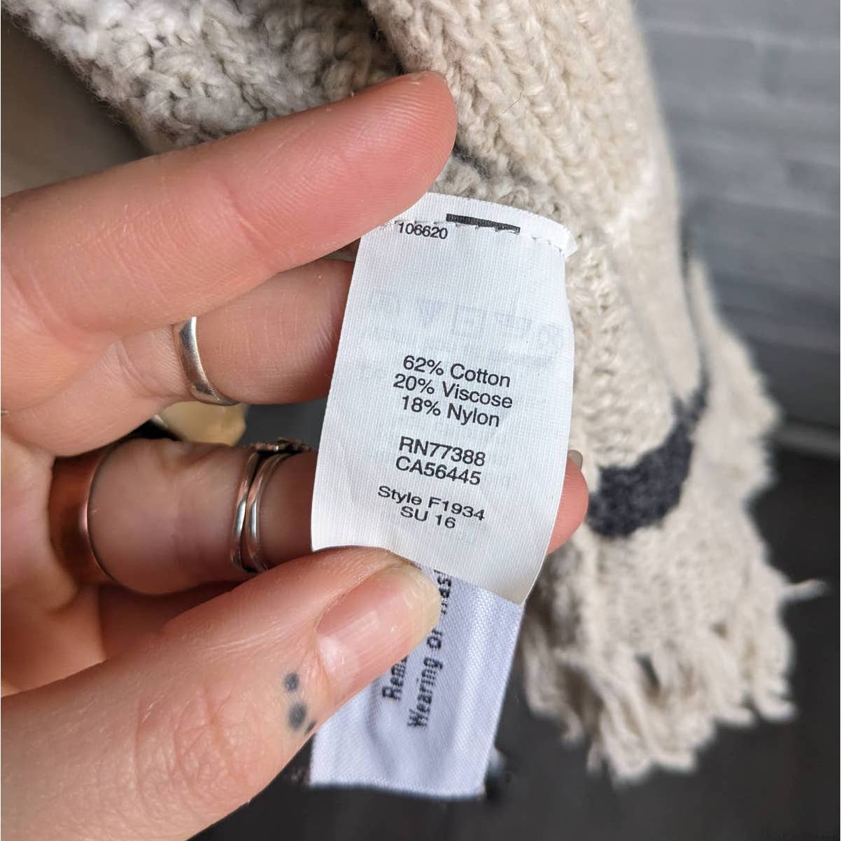Love this classic closet staple longline fringe knit vest by Madewell. Southwest desert cowgirl does boho hippie woodsy vibes. Super soft cotton blend in neutral beige tan earthtones with muted minimalist stripes in faded stormy grey and off white. Shaggy fringe accents, open front fits a range of sizes. Longline silhouette perfect for layers. Mid-weight high quality knit. Gently used, in excellent condition.