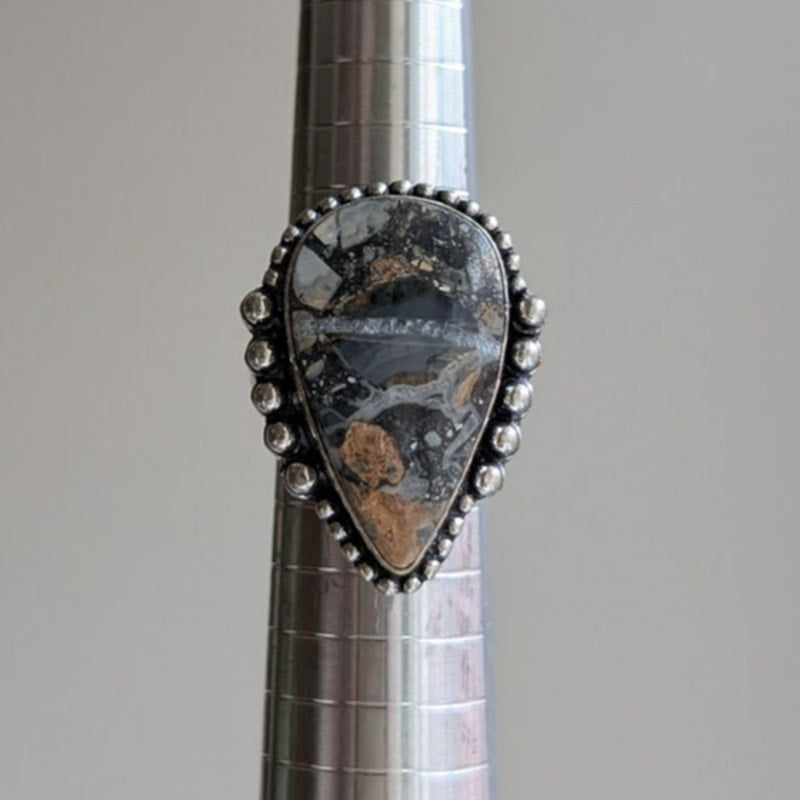 Love!! Gorgeous teardrop natural agate stone ring with earthy grey hues and swirly rusty brown black highlights. Super cute chunky oversize look, distressed cable edge. Witchy minimalist earthy girl does femme boho chic vibes. Perfect accessories to complete your fav almost famous penny lane jacket or biker baddie leather looks! Seated in sterling silver plated band, likely not full 925 silver. Excellent quality at a deal! Handcrafted. New.