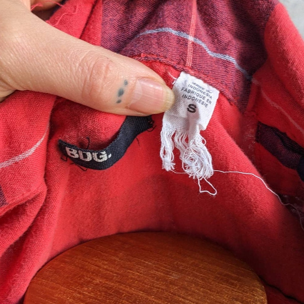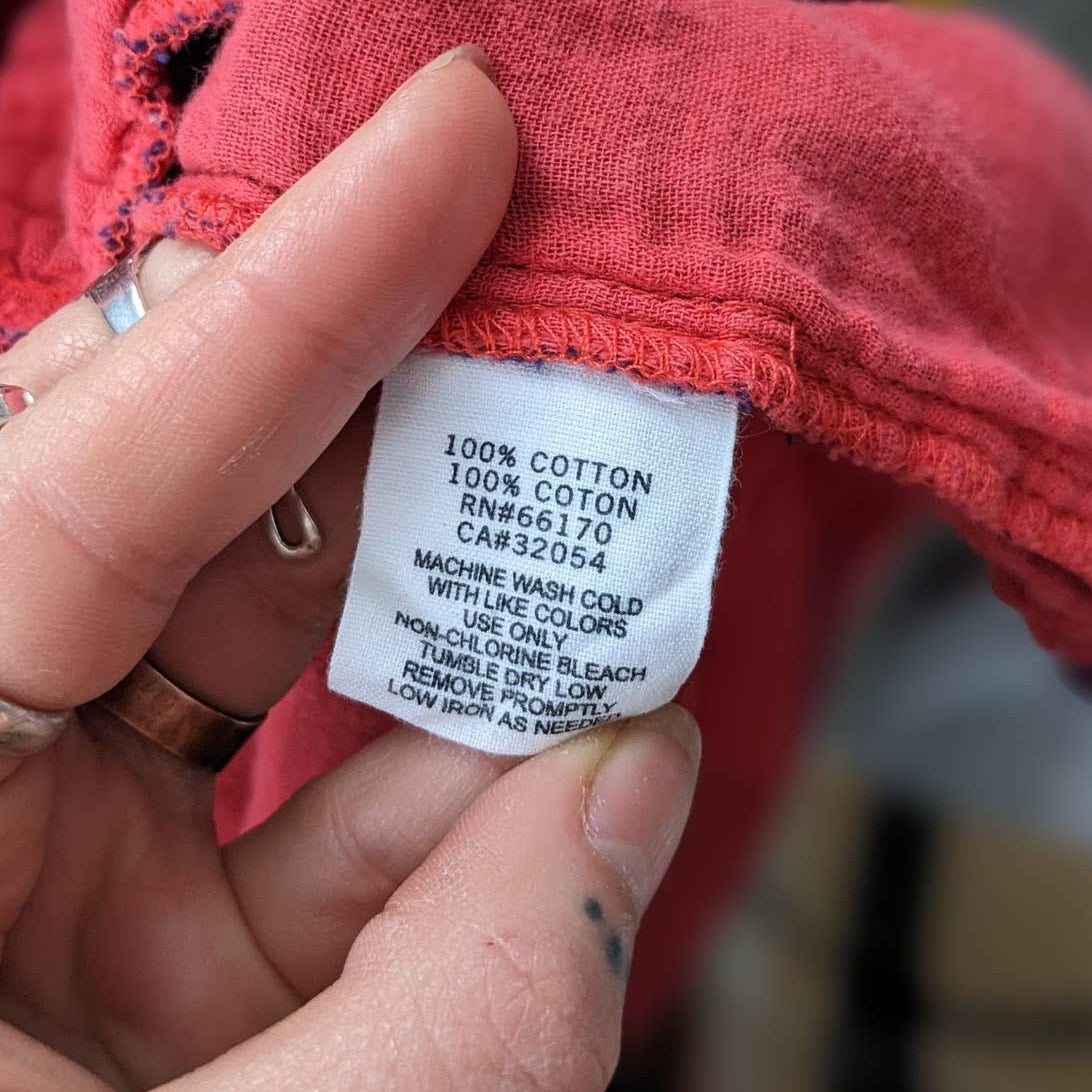 Dope little grunge classic plaid summer dress with pockets! Super soft and breathable 100% cotton. 90s skate grunge does mega cute western cowgirl vibes. Shades of muted blues on vibrant color pop red. Full button down front, roll tab sleeves, collared neckline. Light to mid-weight, fully lined. Gently used, in excellent condition