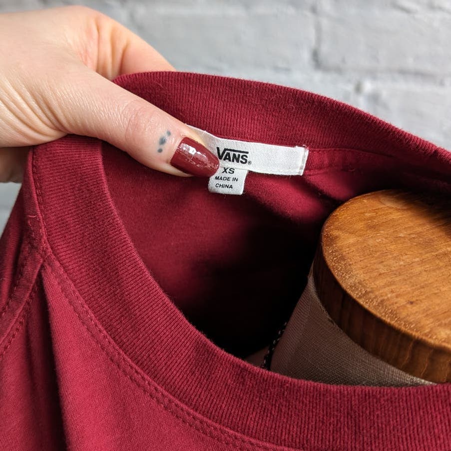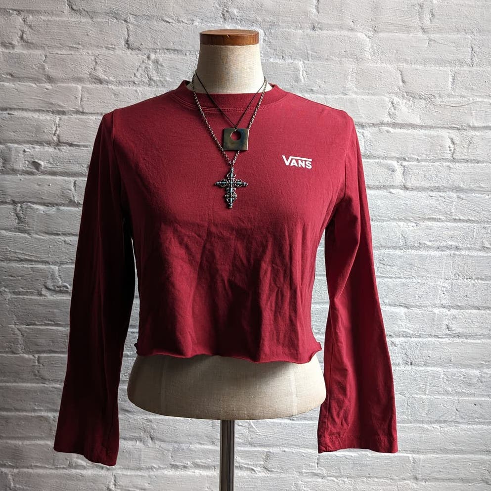 Closet staple from classic skate brand VANS. 90s vintage inspired oversize retro grunge skate vibes. Super soft deep maroon red 100% cotton graphic tee with vans spellout across chest. Awesome trippy colorblock check racing print along shoulders. Oversize fit, crew neck, long sleeves. Raw hem crop, has good stretch. Gently used, in excellent condition.
