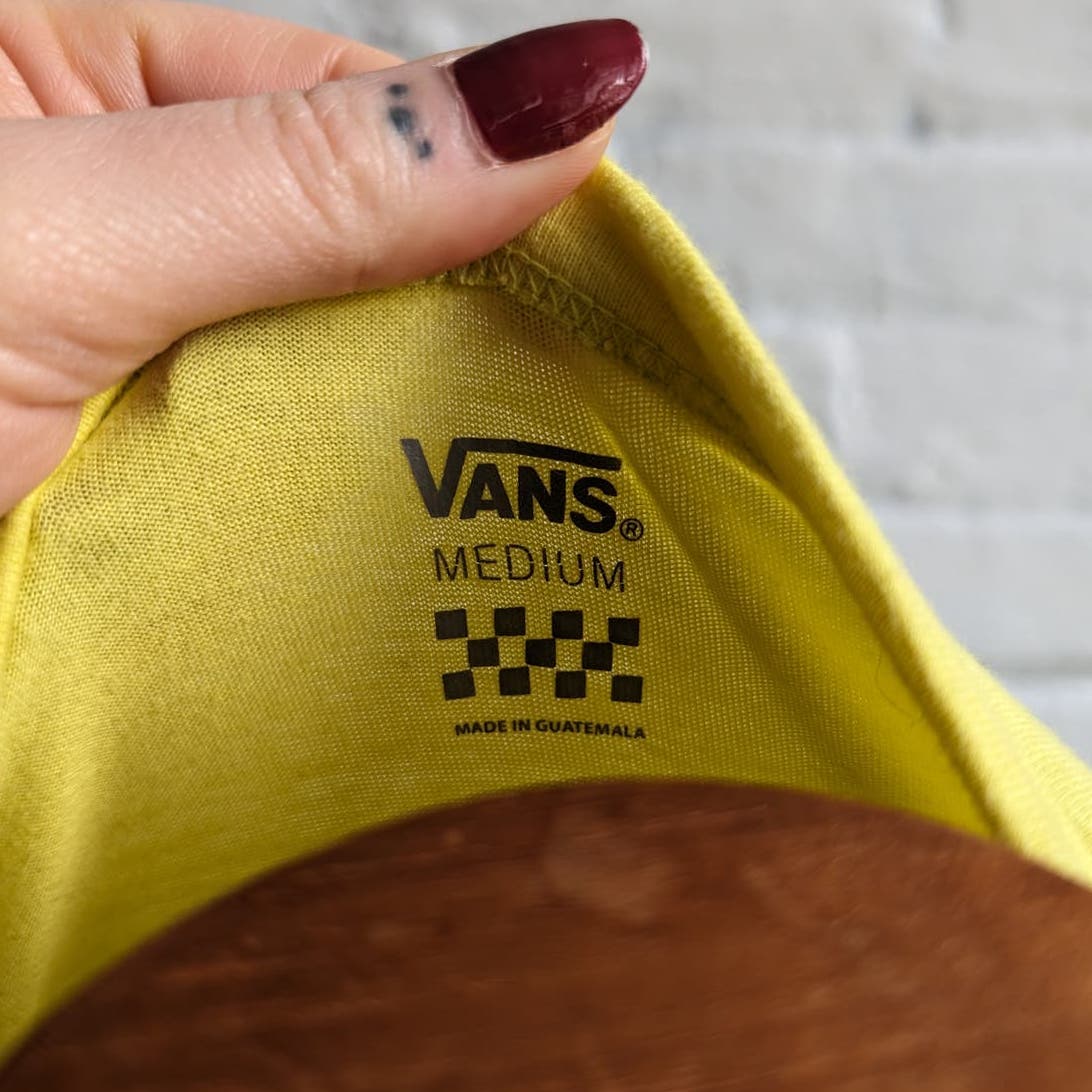 Closet staple from classic skate brand VANS. 90s vintage inspired retro grunge skate vibes. Super soft color pop bright yellow on 100% cotton. Off the wall vans spellout across chest. Awesome trippy print along sleeves. Gently used, in excellent condition.