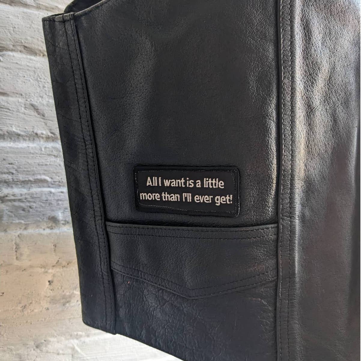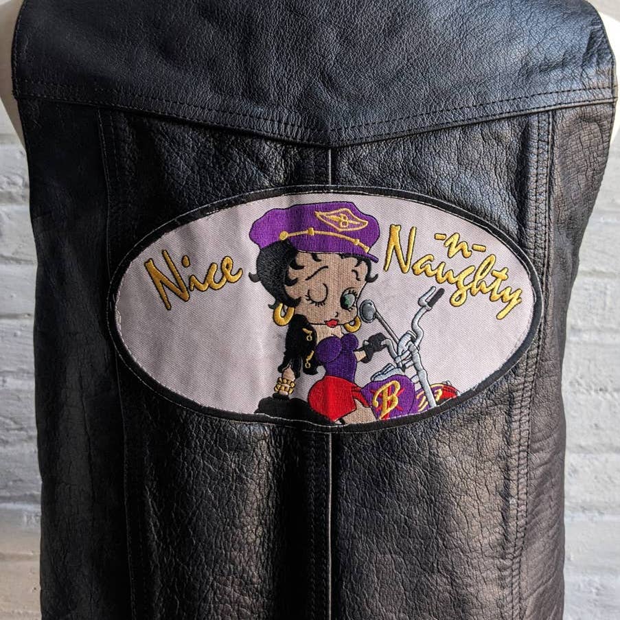 LOVE!!! Classic all black genuine leather protective riding biker vest. Biker granny grunge does 90s baddie death metal vibes. Leather is smooth and has the most amazing patches including a large Betty Boop patch on back. Naughty + nice, soo hot! Sexy v neckline, snap front closure, spacious front pockets. Fully lined. This is a mid-weight protective riding vest.