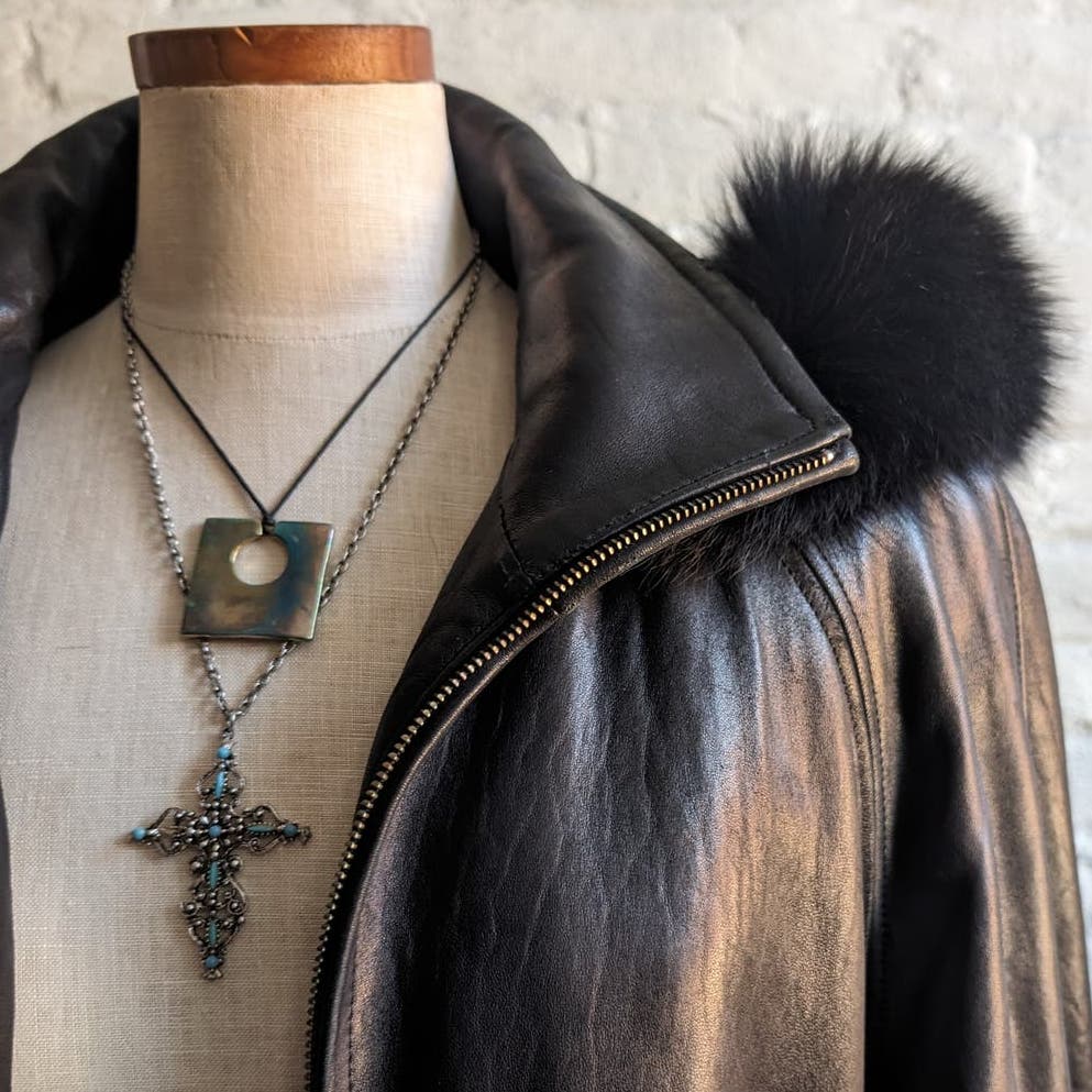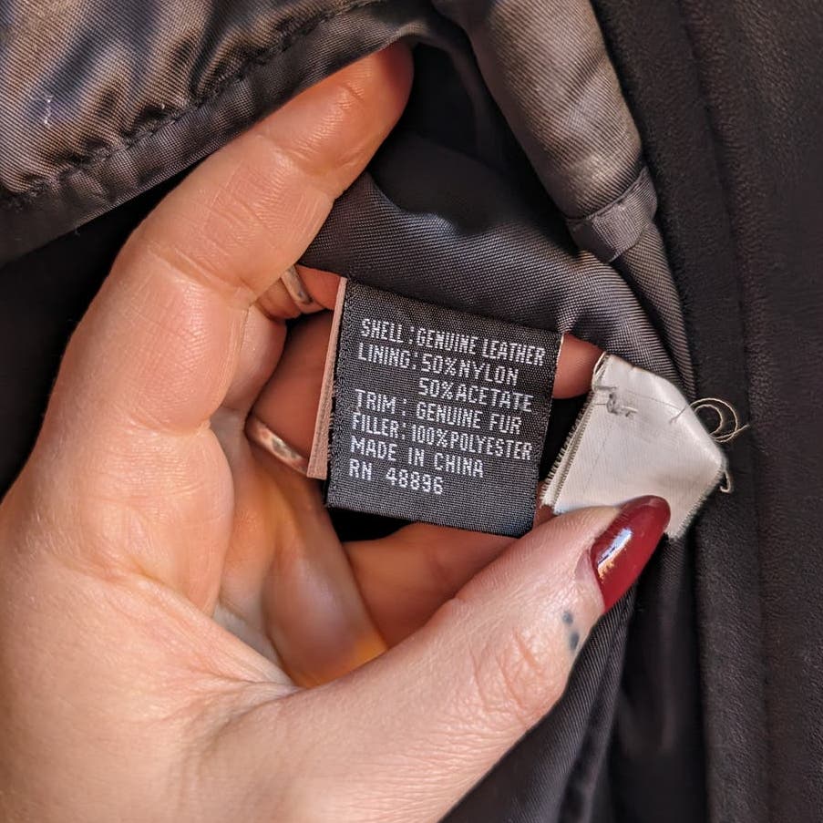 Vintage Black Leather Biker Fur Trench Coat Minimalist Penny Lane Duster Jacket