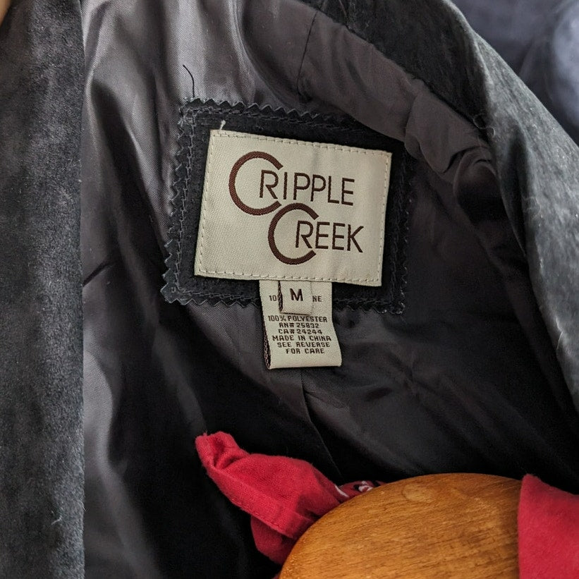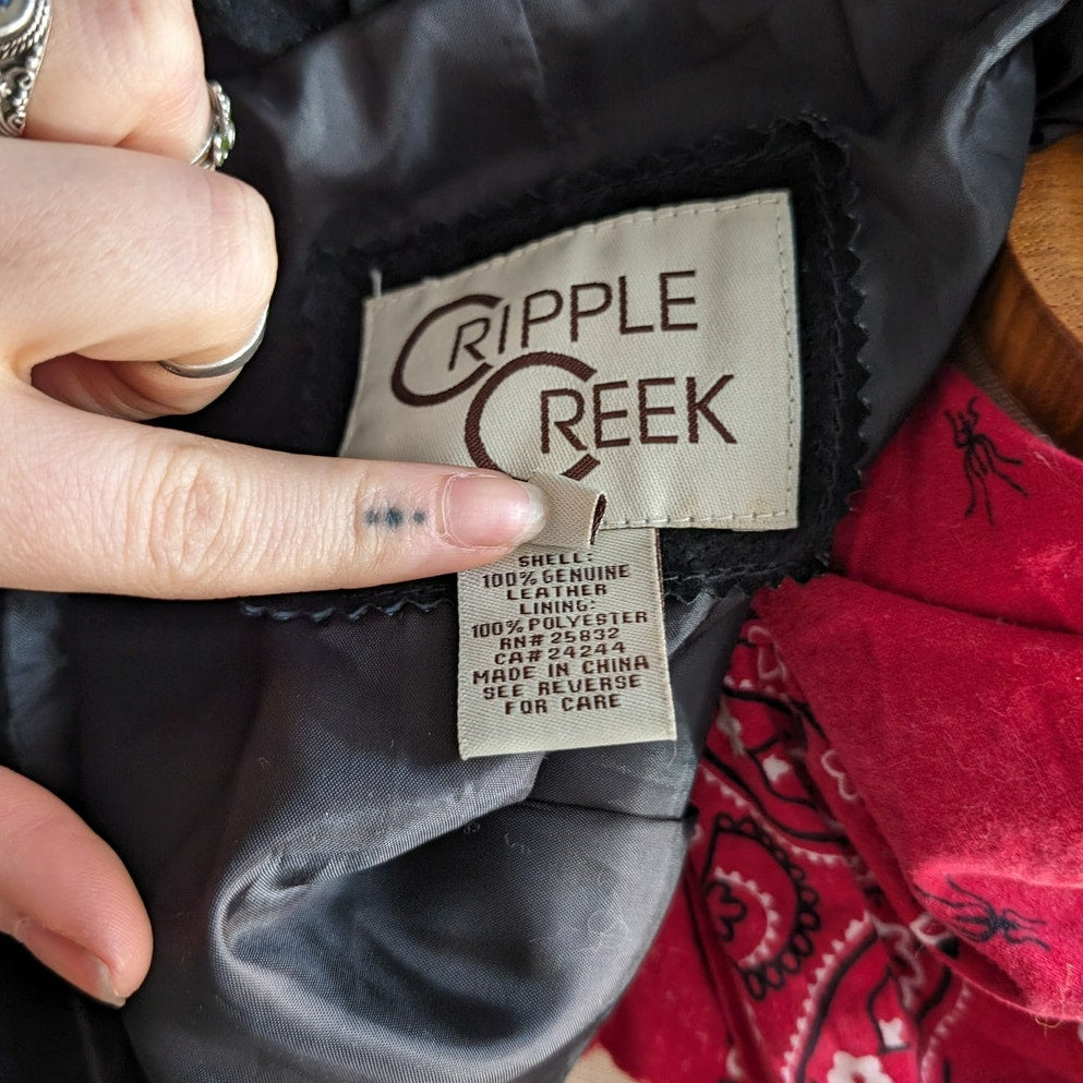 Love this one from western wear heavy hitters Cripple Creek. Shaggy fringed out sexy biker vibes for days. Classic minimalist all black suede leather with amazing rope like fringe tassels and gorgeous woven leather accents throughout. So unique! 70s rockstar girlfriend does death metal cowgirl vibes. Single button closure, lightly padded shoulders, cropped silhouette. Light to mid weight perfect for layers, fully lined. Ready to rock your next adventure. Gently used, in excellent vintage condition.