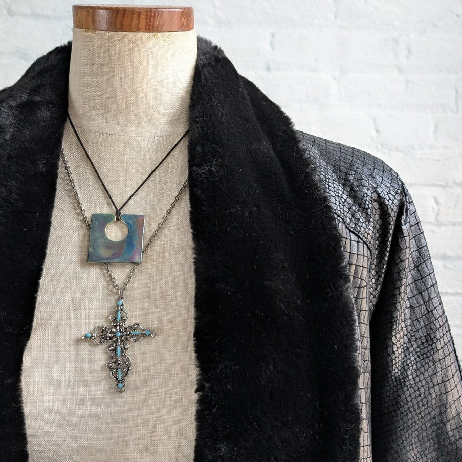 Vintage Black Leather Faux Fur Trench Coat Penny Lane Grunge Snakeskin Jacket