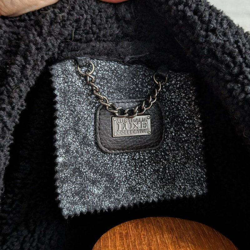 Vintage Black Leather Shearling Coat Afghan Fur Minimalist Chic Luxury Jacket