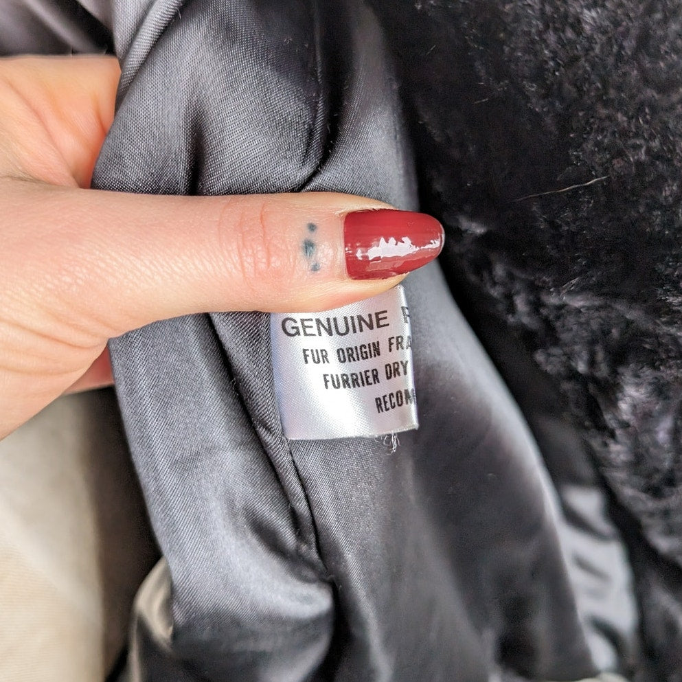 Love this super chic rabbit fur coat in classic jet black. Real genuine fur outer with stretchy cozy ribbed cuffs in bomber jacket styling. 90s witchy grunge babe does 70s penny lane almost famous vibes! Cute split collar, front pockets to hold all your treasures, silky soft full lining. Clasp closure. This beauty has seen some love with some wear and tear along back bottom hem and shaggy fur throughout, see photos. Perfect party fur! Gently used, in good vintage condition.