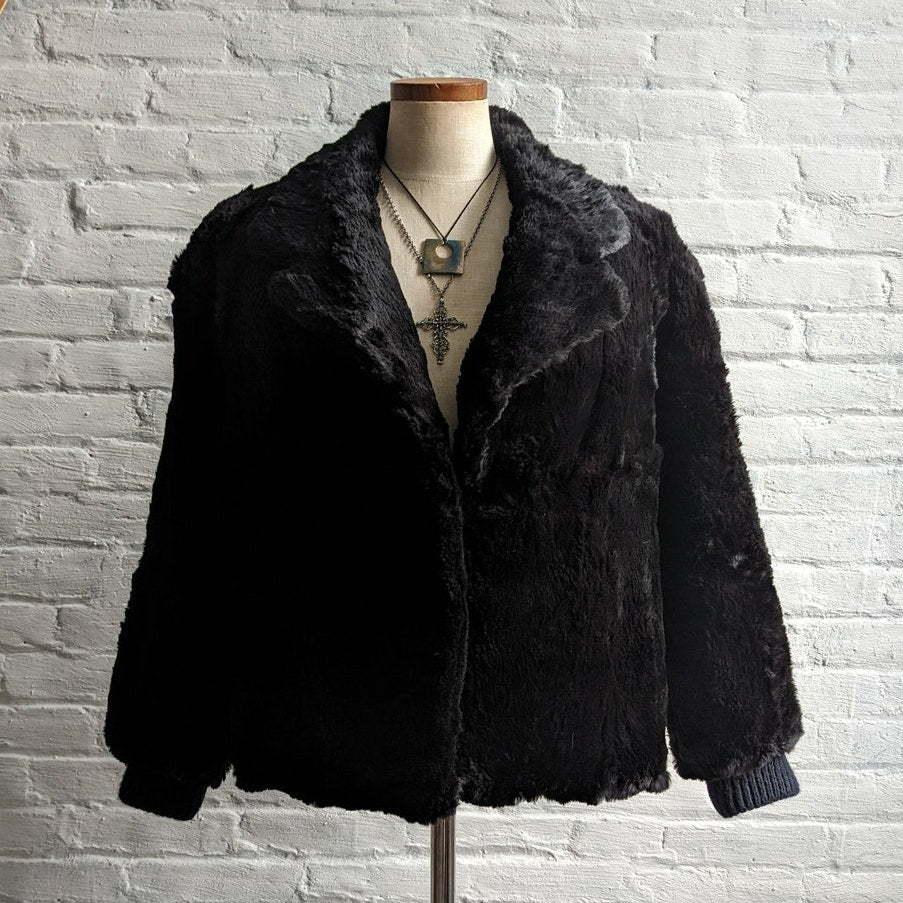 Vintage Black Rabbit Fur Bomber Coat Minimalist Shaggy Furry Fuzzy Moto Jacket