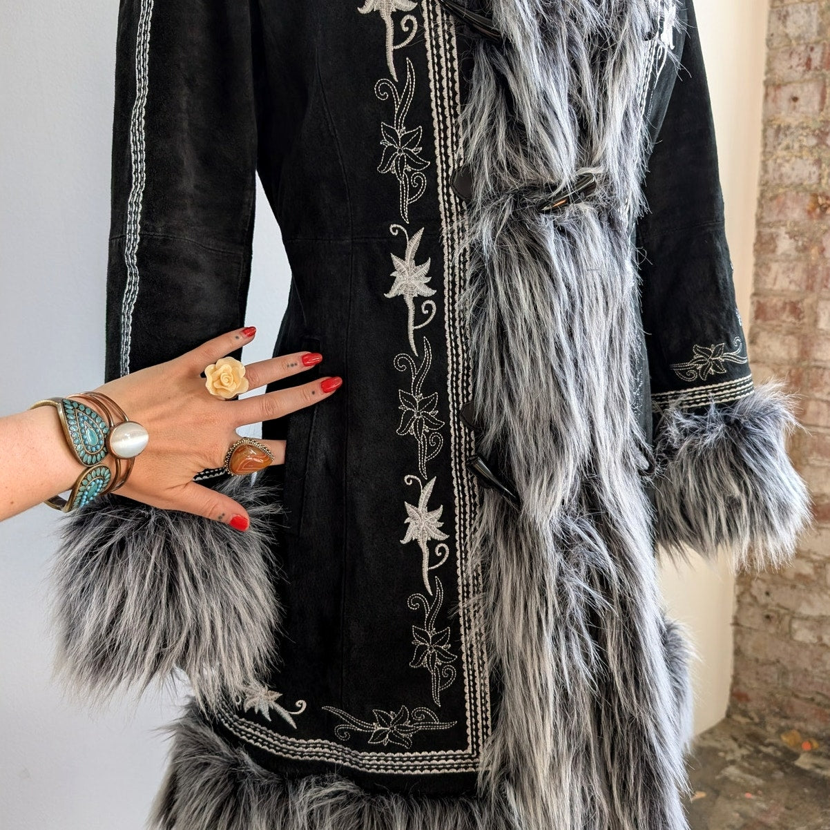 Obsessed!! She's got a hood! Major 70s rockstar girlfriend does 90s boho chic festival babe vibes! Stunning genuine suede leather penny lane dream coat with insane psychedelic embroidered floral tapestry design. Classic jet black. Sexy shaggy faux fur trim in soft minimalist black and white. Quilted lining, pockets, full toggle front closure. Heavy weight, longline silhouette. Gently used, excellent vintage condition.