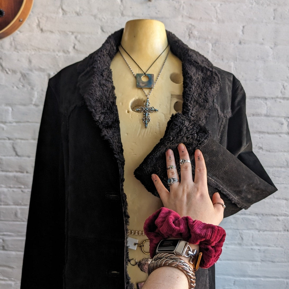 Vintage Black Suede Jacket Penny Lane Coat Minimalist Leather Furry Fur Goth