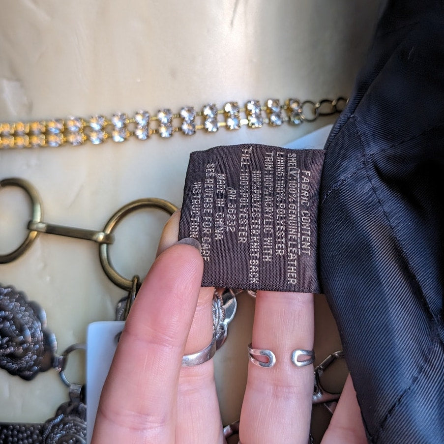 Looove this one! Gorgeous patchwork style genuine suede jet black jacket with beautiful faux shearling fur accents at collar and cuffs. 70s almost famous does 90s penny lane goth girl vibes. Cuffs can be worn turned up or down. Double dagger collar. Button front closure. Faux fur + quilted thermal lining. Beautifully broken in soft supple suede. Midweight. Minor scuffs consistent with age. Gently used, in good vintage condition.