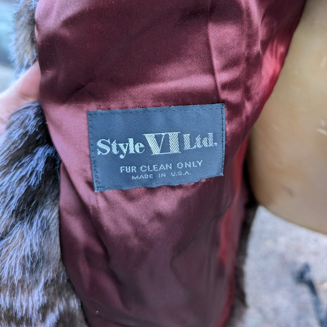 Striking! Obsessed with this gorgeous well cared for rusty chocolate brown faux mink fur coat. 70s almost famous does witchy rock star girlfriend vibes. Unique ombre chevron shag is luxurious and baby soft. Beautiful wispy silver white accents throughout. Elegant mock neck is extra cozy. Gorgeous dark cherry red satin lining. Clasp front closures with hidden button at neck, pockets! No balding or matting. Cozy mid-weight jacket. Hits mid thigh on 5'4 model. Gently used, in excellent vintage condition.