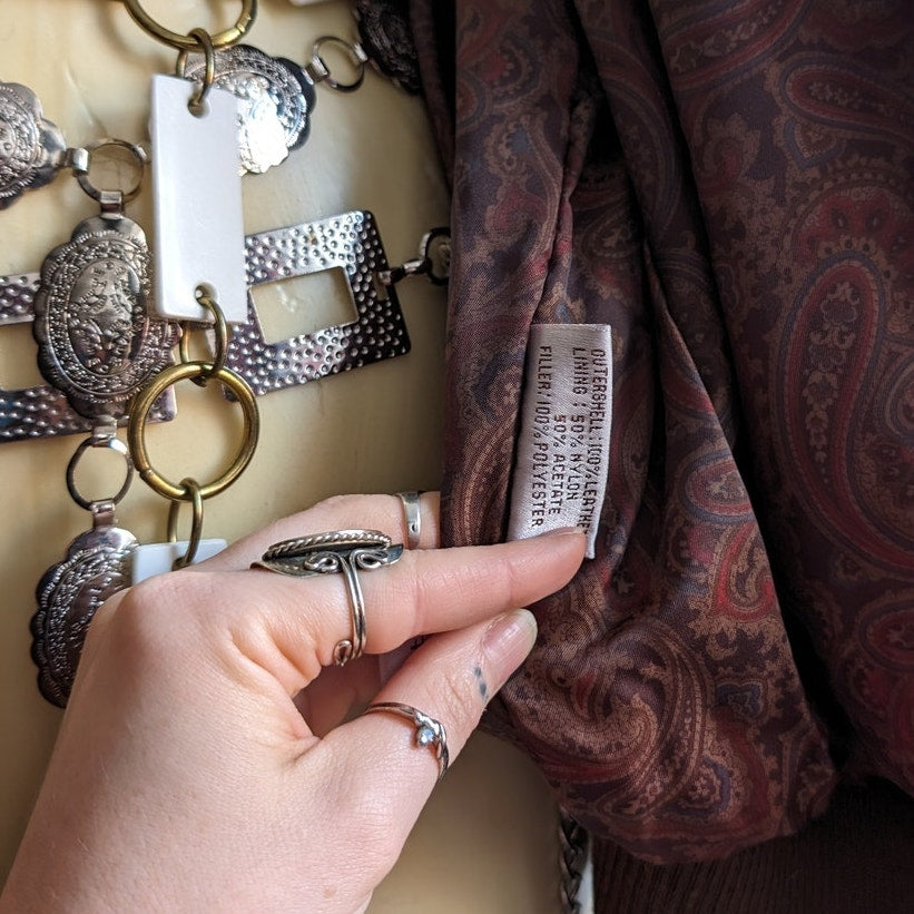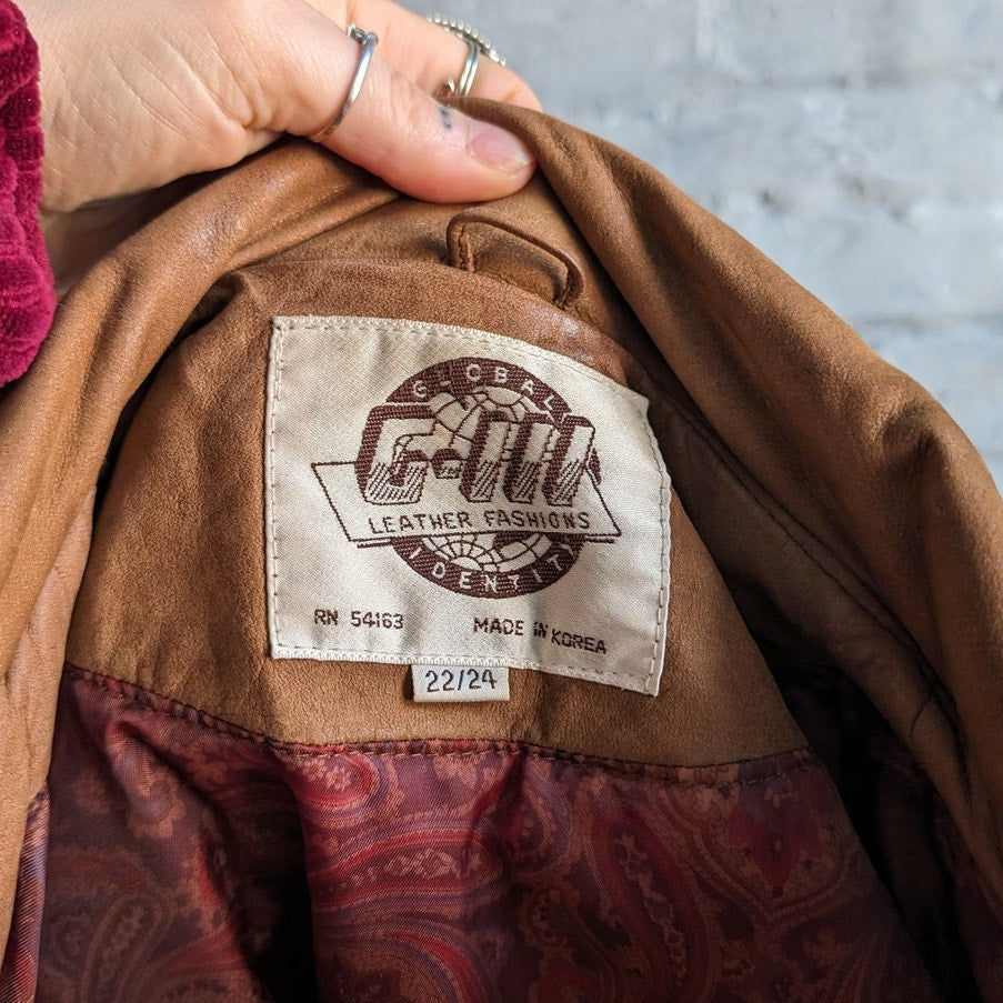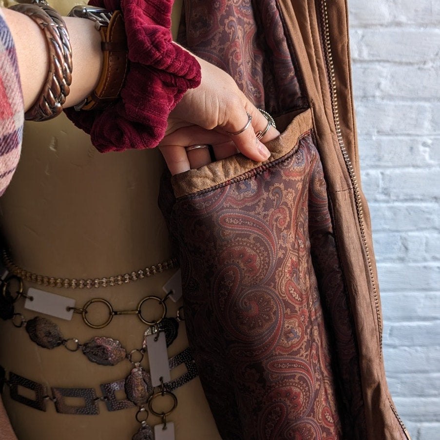 Dope little classic vintage leather bomber with rustic details throughout. Giving 70s hippie cowboy does 80s desert minimalist vibes. Buttery soft suede in warm caramel brown. Ribbed cuffs and hem. Slouchy oversized silhouette features zipper front closure, lots of big pockets including inner stash pocket. Shoulder pads. Silky soft swirly paisley accent thermal lining. Midweight. Tiny hole, few small marks and dark spots, see photos. Perfectly worn and ready to rock your next adventure. Gently used, in good vintage condition.