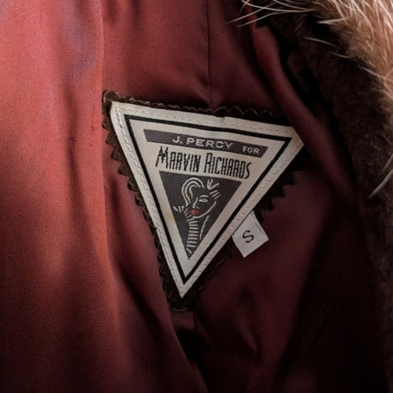 Loving this minimalist closet staple on the iconic Marvin Richards line. Vintage classic!! Super soft genuine suede mini trench coat in beautiful rich earthy brown. 80s boho nature girlie does 90s grunge city girl vibes. Stunning real fox fur collar in gorgeous neutral tones. Silky satin lining throughout. Internal cinch for a fitted look, pockets. Button closure. Heavy weight cozy warm! Minor scuffs consistent with age. Gently used, in excellent vintage condition.