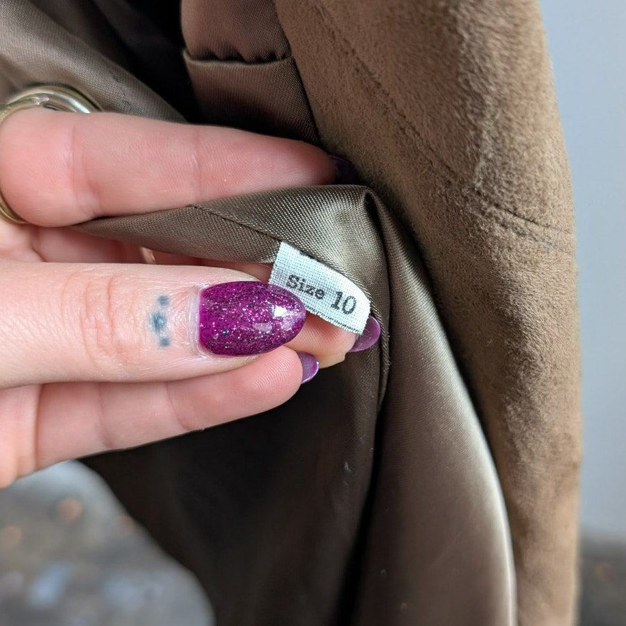 LOVE!! Major 70s almost famous boho chic does 90s minimalist princess vibes. Gorgeous vintage genuine suede super soft penny lane mini trench with sexy shaggy fuzzed out shearling fur trim. Neutral earth tone teddy bear tan brown colorway. Cinched belted waist for the perfect fit. Front pockets! Longline silhouette, light to midweight perfect for layers. Minor wear consistent with age. Gently used, in very good vintage condition.