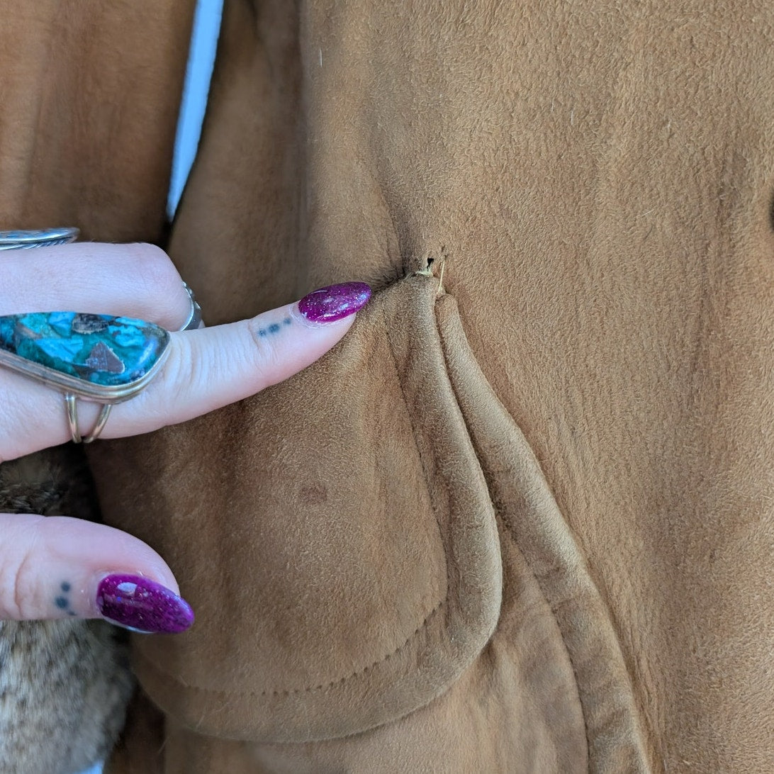 Vintage Brown Suede Fur Trim Penny Lane Jacket Furry Leather Trench Coat Medium