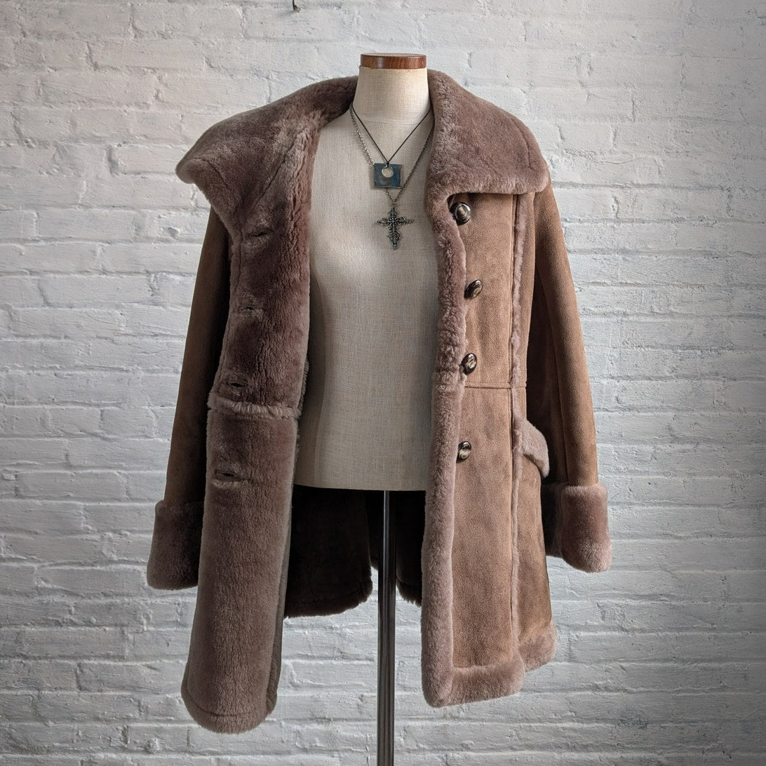 Vintage Brown Suede Leather Penny Lane Coat Shearling Minimalist Cozy Fur Jacket