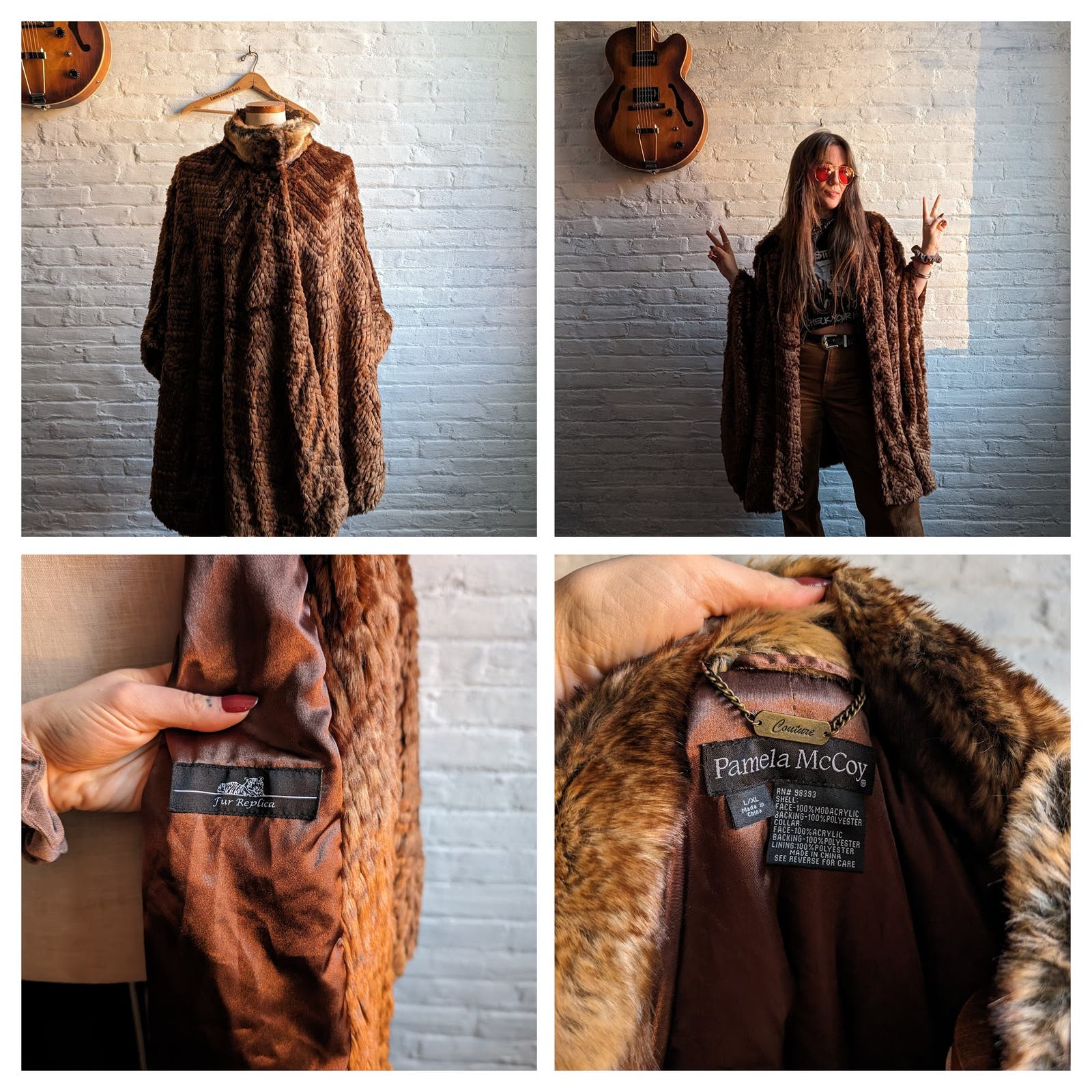 Love! Rad little vegan rabbit fur oversize shaggy penny lane poncho in gorgeous burnt orange brown. Chic 70s almost famous does rock n roll grunge fairy vibes. Fur is incredibly soft and looks like the real deal! Sexy flowy slouchy look and feel. Cozy chic. Mandarin mock neck with single accent button closure at neck. Silky soft fully lined. Fits a range of sizes with open front and oversize silhouette. Gently used, in excellent vintage condition.