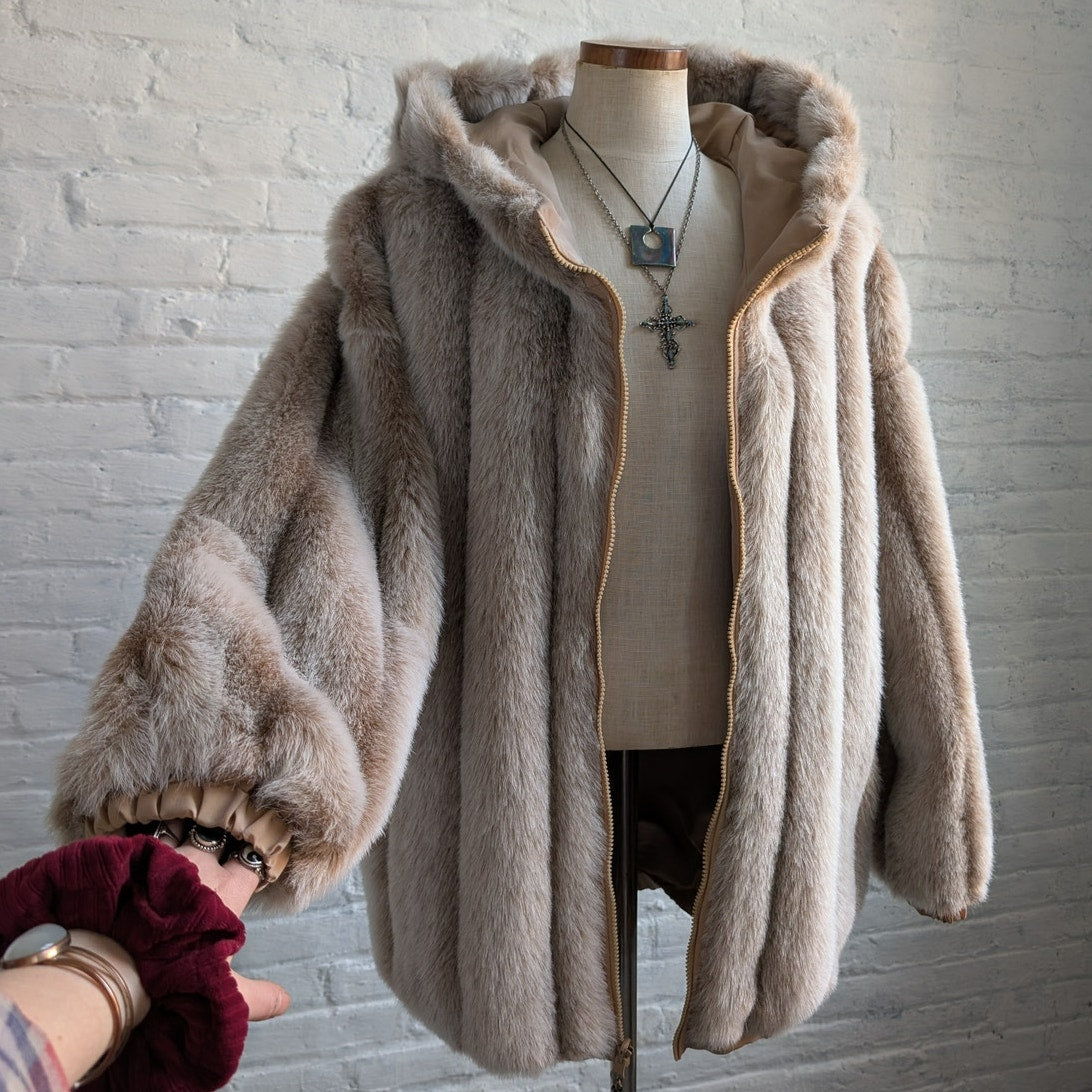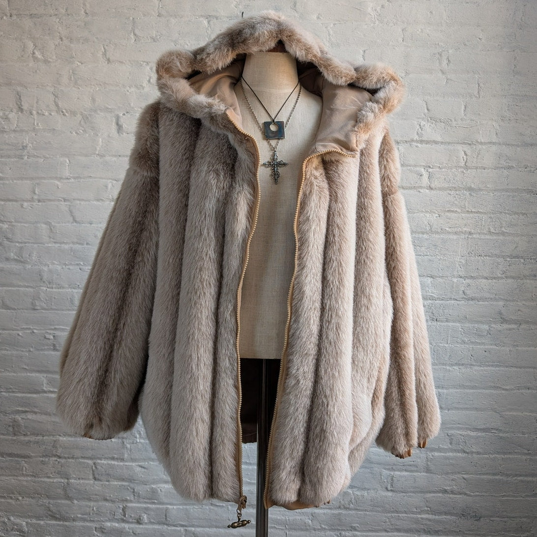 Vintage Faux Fur Neutral Plush Coat Mob Wife Furry Cozy Glam Fuzzy Jacket