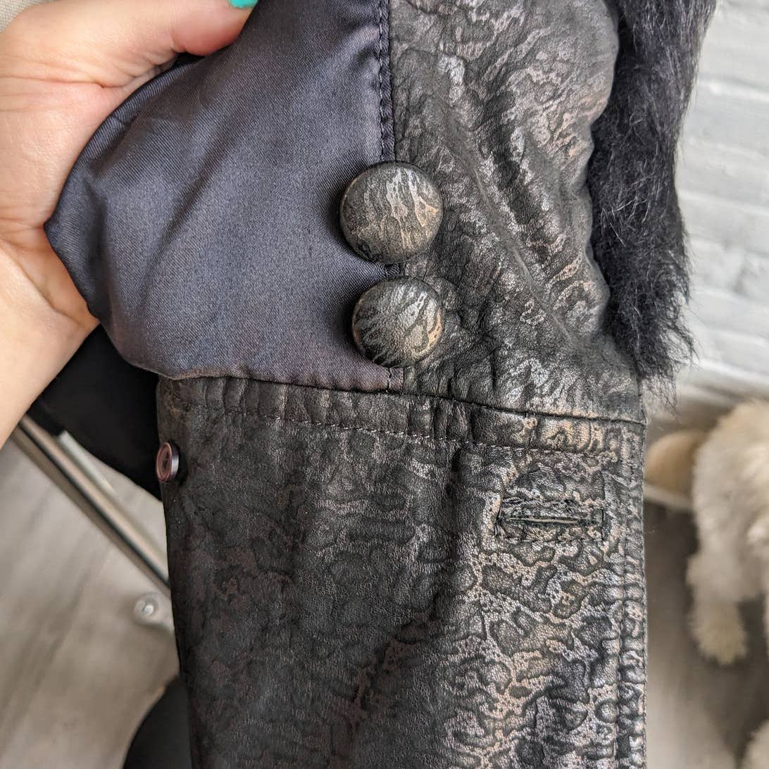 Badass beauty! Vintage genuine leather trench with sexy tapered longline silhouette. Embossed snakeskin throughout with soft suede like feel. Wispy jet black spanish lamb fur collar. Silky soft satin lining. Drop dolman batwing sleeves. Shoulder pads, side pockets. Leather buttons at cuffs and bottom hem.