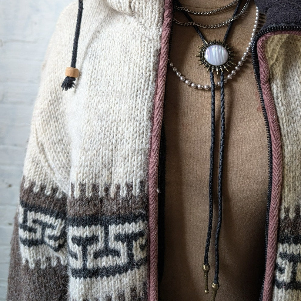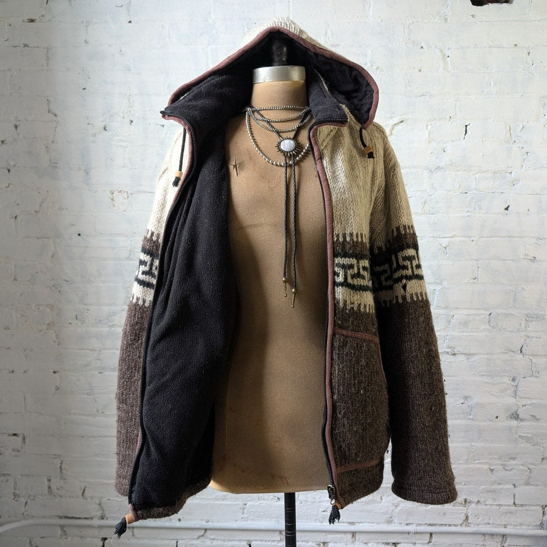 Dope little vintage 100% wool sweater jacket from Nepal! 70s hippie snow bunny does 90s winter grandpa chic vibes. Gorgeous knit outer shell in chocolatey browns and neutral creams. Incredibly soft and plush fleece lining- no itch! Love the cinching hood, pockets. Zipper front closure with cinching bottom for fitted look. Mid to heavy-weight. A few small holes in wool, some piling. Gently used, in good vintage condition.