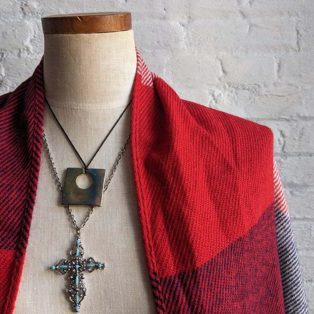 Loving that this rad little classic longline plaid scarf can double as an oversize wrap for extra coverage. Rustic plaid flannel heathered pattern. 70s western cowgirl does earthy rustic lumberjack vibes. Classic red white and navy blue Americana tones. Sexy fringe trim. Super cozy cashmere soft. Perfect for layering as a scarf or light weight wrap. Would look equally gorgeous as a bed drape or wall hanging. Gently used, in excellent condition.
