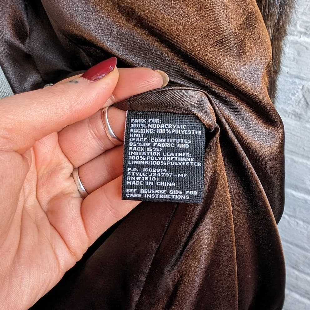 LOVE! Major 70s almost famous rock star girlfriend does minimalist mob wife chic vibes. Pristine and incredibly soft rusty brown black faux mink with the baby fine softness of fox fur. Plush lux oversize collar with slightly flared princess sleeves. Cozy warm, longline silhouette. Slouchy oversize fit. Clasp closures with single accent button at neck. Front pockets, silky soft full lining. Inner elastic cuffs keep the chill out. Hits mid thigh on 5'4 model. Like new, in excellent condition.