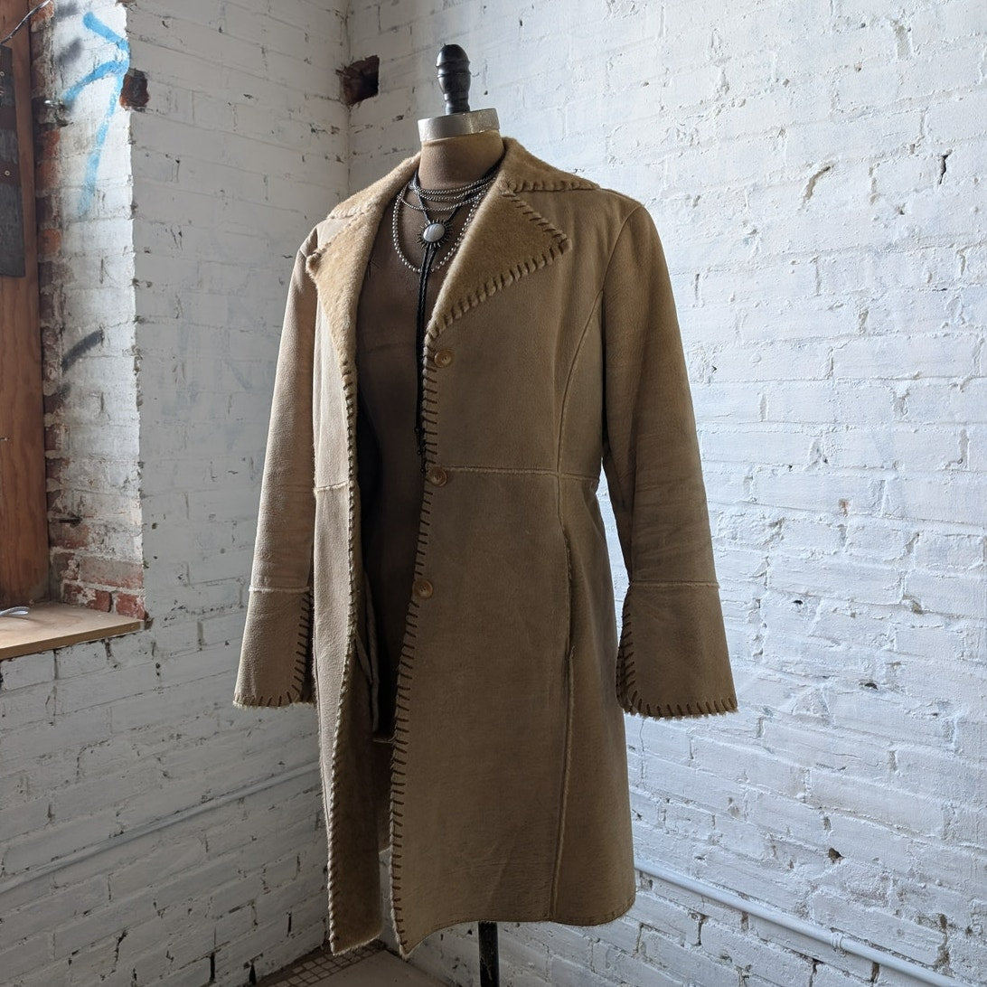 Vintage Neutral Tan Suede Leather Duster Groovy Boho Faux Fur Trench Coat Jacket