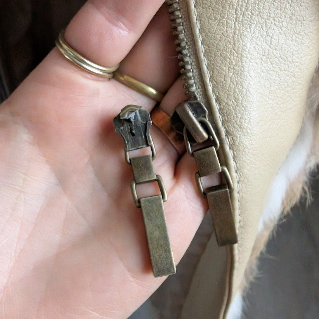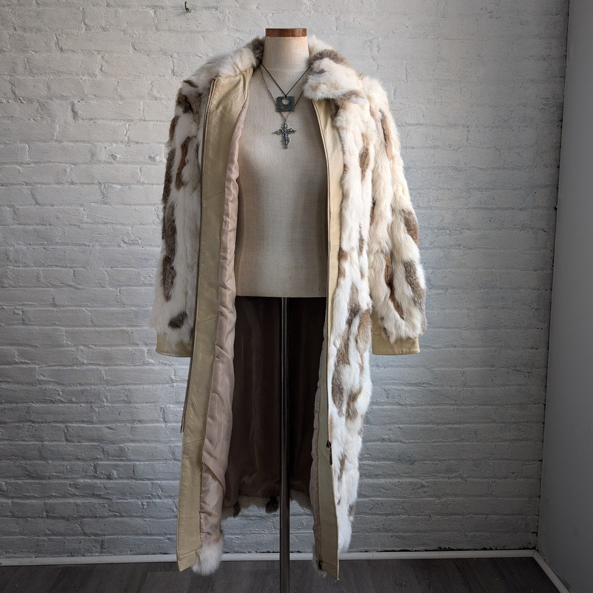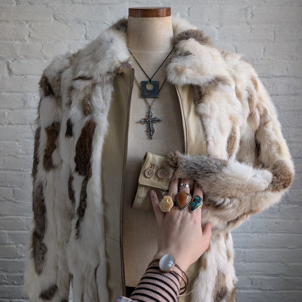 GORGEOUS for my baddies on a budget! Has cosmetic damage - selling AS IS! Read + see all photos! Super unique genuine rabbit fur patchwork penny lane trench coat. 70s almost famous moto babe does 90s ski bunny vibes. Baby soft fur with genuine leather accents in sandy tones. Pockets! Mid-weight. Gently used, in cosmetically fair vintage condition / otherwise very good + recently dry cleaned.