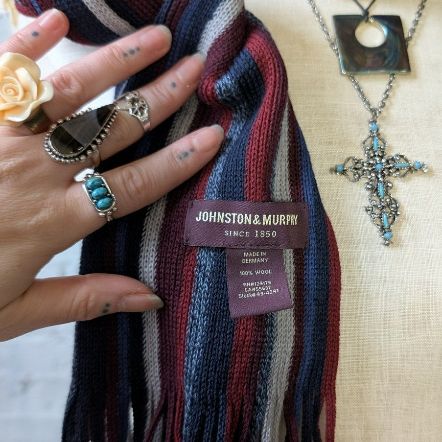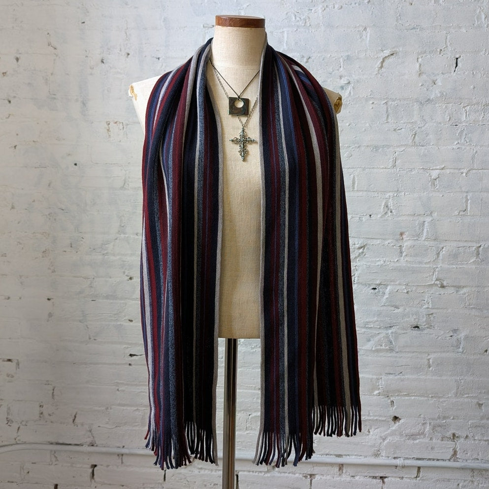 Gorgeous classic longline knit scarf made from 100% cozy warm wool. 80s academia chic does 90s artsy grunge vibes. Ribbed striping in muted blues, reds and neutral tones. Stretchy, soft with shaggy fringe trim. No itch! Perfect for layering. Gently used, in excellent condition.