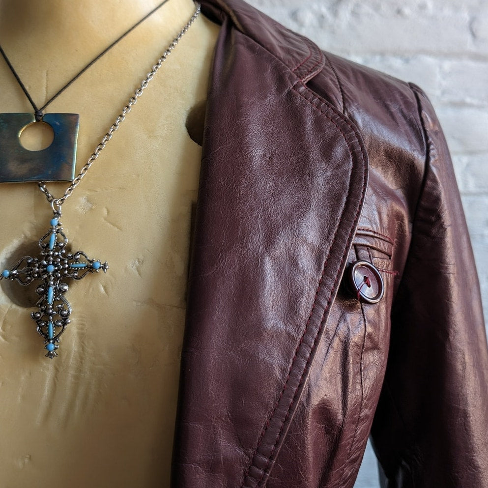 Closet staple classic vintage genuine leather blazer in gorgeous ox blood deep maroon red tone. Major dark academia alt girlie does 90s femme biker babe vibes. Leather is nicely broken in and flexible. Really cute rounded collar, chest stash pocket, gorgeous accent lining, dual button front closure, functional front pockets. Lightweight excellent quality leather blazer for your collection. Small pin pricks on lapel. Gently worn, in excellent vintage condition.