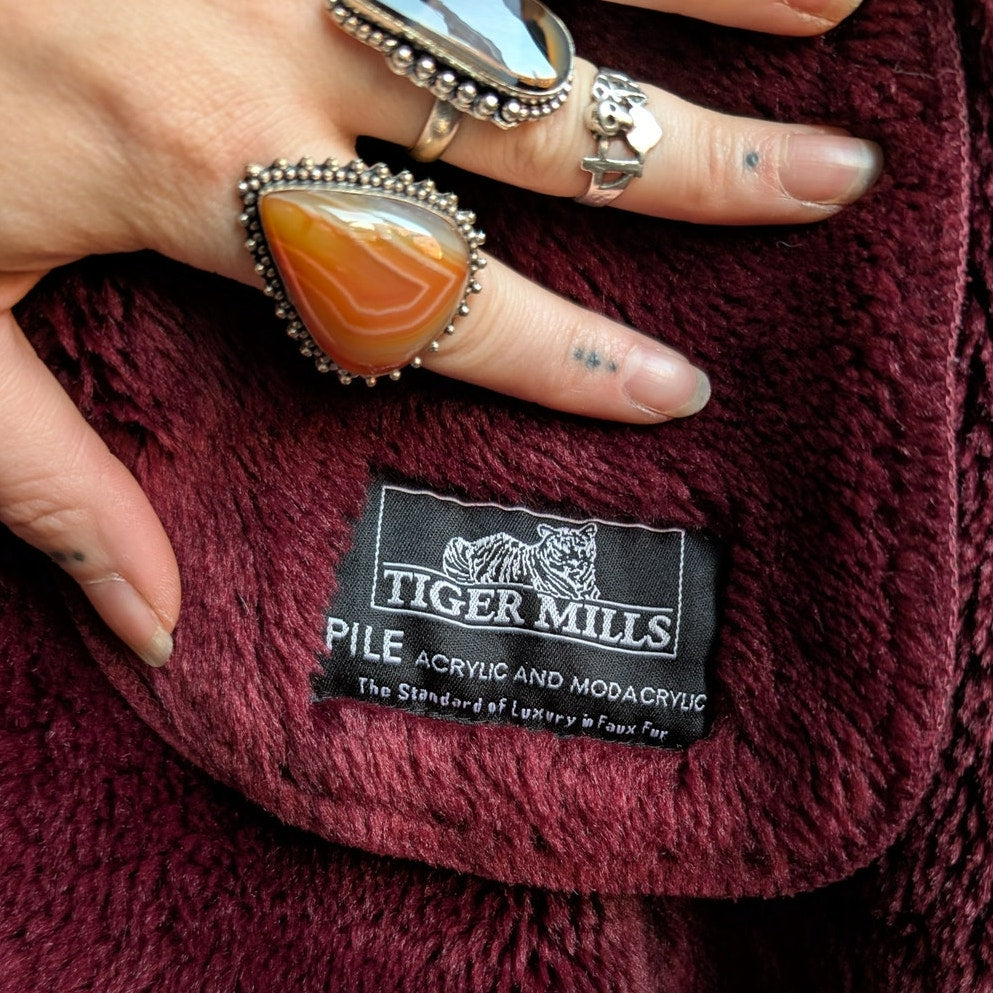 LOVE!! Gorgeous floor length festive chic penny lane trench in the perfect muted holiday vibe! Major 70s rock n roll girlfriend does 90s minimalist dark romance vibes. Deep burgundy maroon faux suede outer with sexy shaggy faux fur collar and trim. Baby soft and so divine! Super cozy full shag lining. Pockets, swirly button front closures. Mid to heavy, perfect for layers. Longline silhouette. Gently used, in excellent vintage condition.