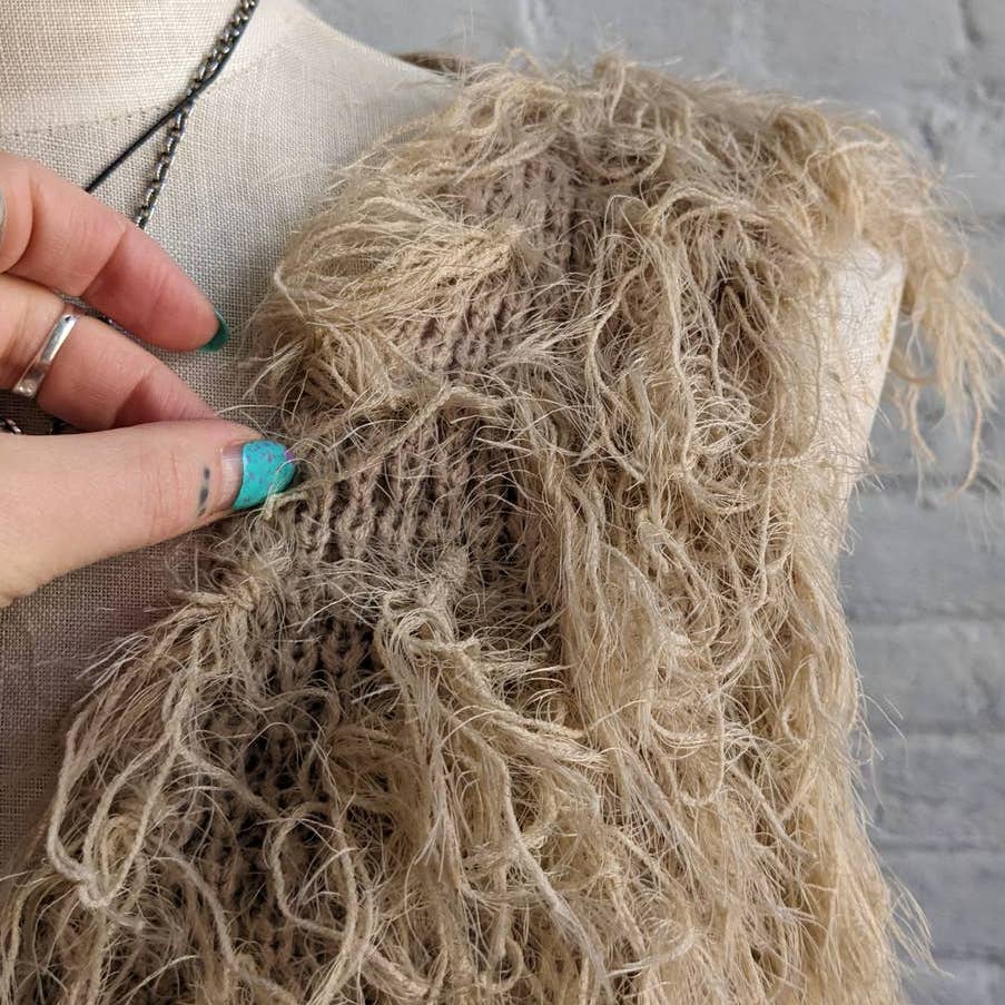 Such a wild piece that's perfect for layering. 70s Daisy Jones rock n roll girlfriend vibes. Feathery soft wispy shaggy fringe vest in neutral sandy tan with chunky open knit. Longline silhouette with single button front at chest for a sexy swinging boho desert chic look. Open front design can fit a range of sizes, add your own belt to accessorize or let it flow free and loose. Light to mid-weight, very stretchy. Gently used, in excellent vintage condition.