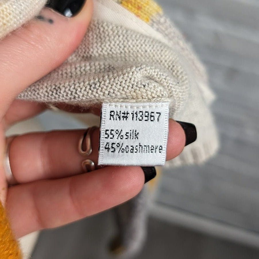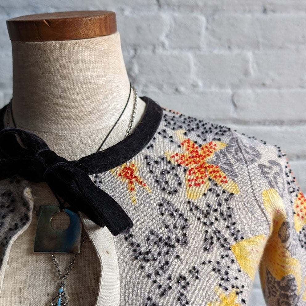 Love this dope little light academia cardigan! Gorgeous silk and cashmere is so luxurious. Features delicate lace beading warm toned yellow orange floral pattern on muted light grey. Cottagecore coquette does preppy garden fairy vibes. Hidden snap button front closure. Soft and lightweight yet cozy, perfect for layers. Japanese made. Gently used, in excellent vintage condition.