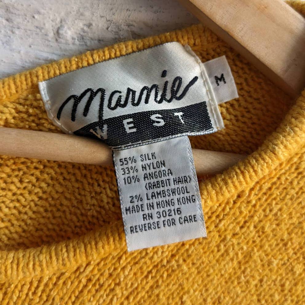 Love! The little bows though! Mega cute super soft color pop sweater with 80s retro does 70s sunshine kawaii vibes. Silk angora wool blend is soft and cozy with beautiful varied knit texture in a gorgeous sunshine yellow mustard tone. Keyhole design, adorable bow details, scoop boat neckline, ribbed cuffs and hem. Light to mid-weight sweater, perfect for layers. Gently used, in excellent vintage condition.