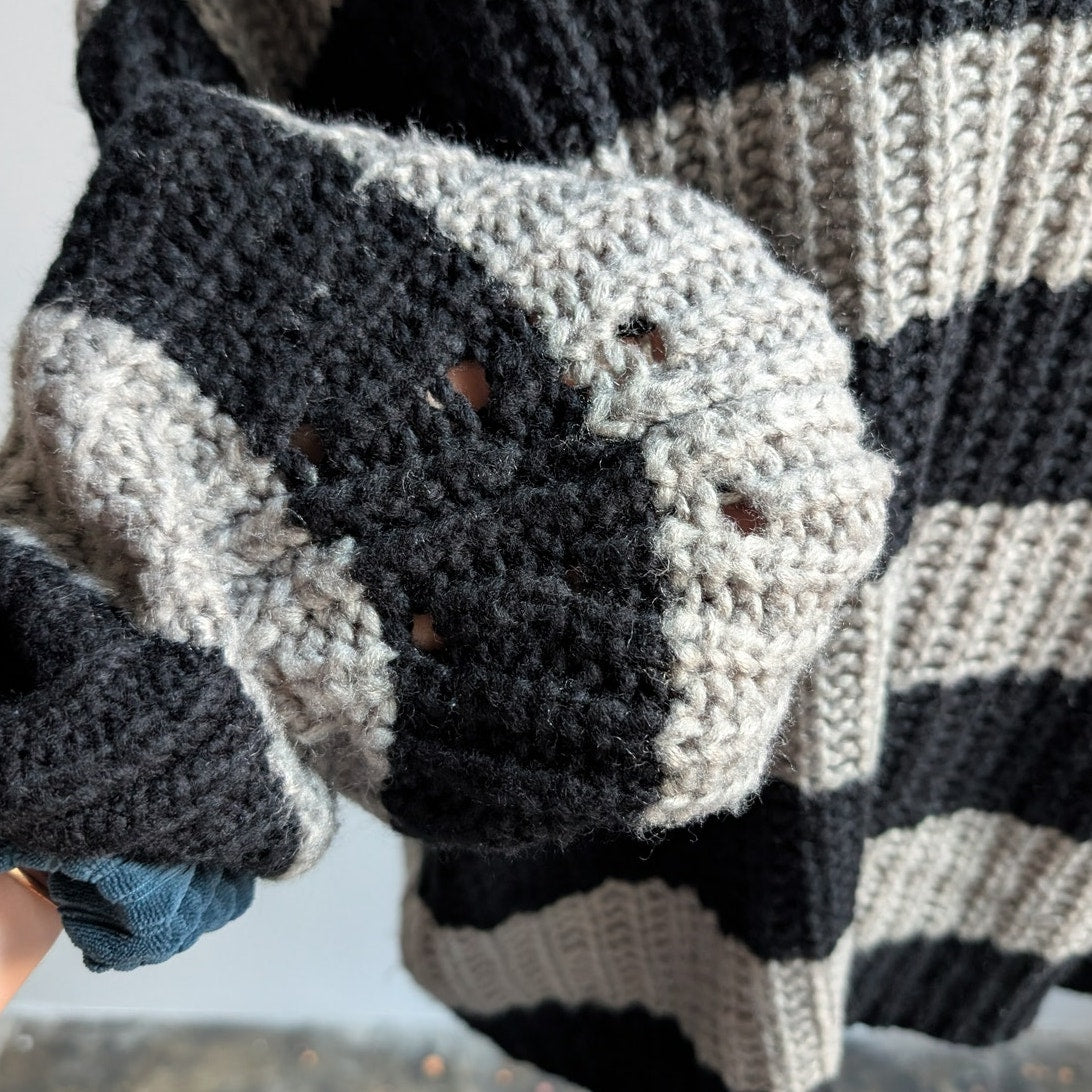 Obsessed with the slouchy oversize chunky knit sweater weather aesthetic. 90s dark cottage grunge girl does nerdcore indie skater babe vibes. Minimalist black and charcoal grey stripes. Crewneck, ribbed details, some stretch. Small intentional holes on back of sleeves - like you can lace it up? Imagine black satin lace up bows, super cute! Light to mid weight, perfect for layers. Gently used, in excellent condition.