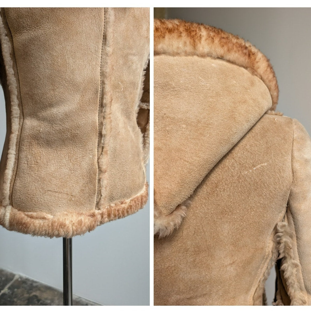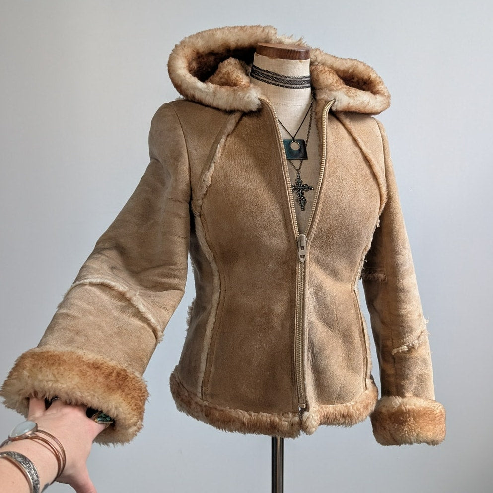 Vintage Tan Suede Shearling Coat Brown Wool Jacket Boho Chic Fur Coat Hood XS