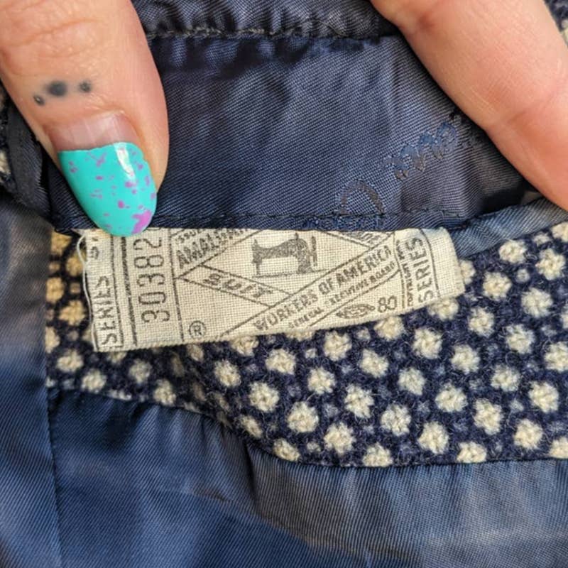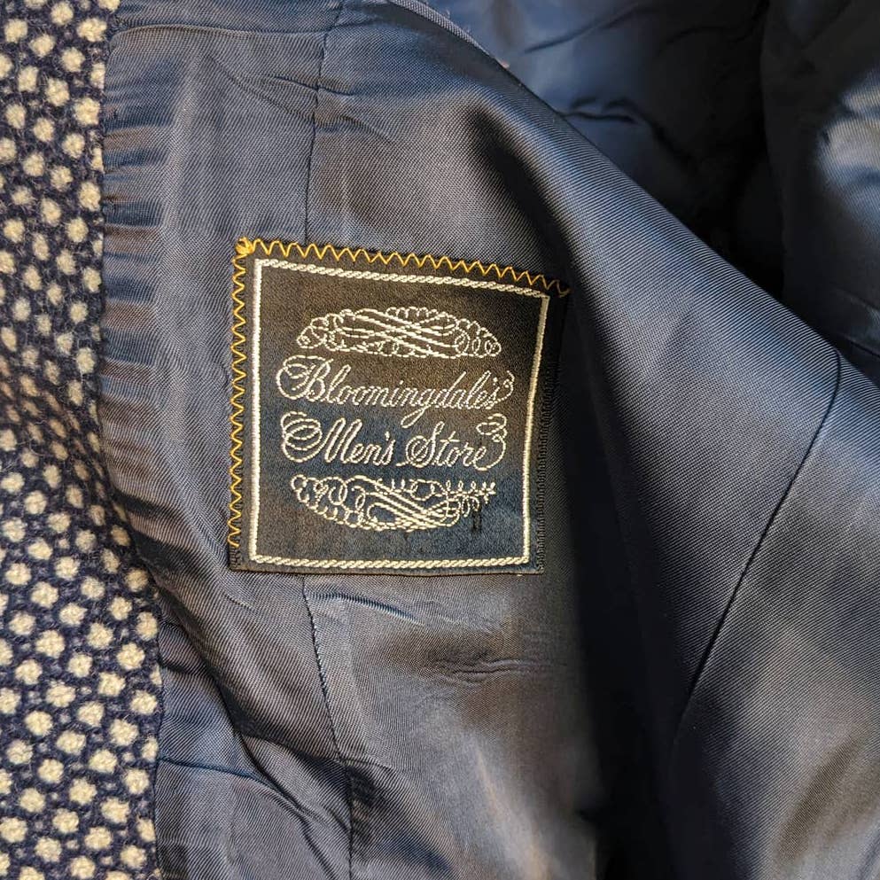 LOVE! Classic stylish 50s / 60s vintage designer Bloomingdale's heavy wool blazer with the sharpest details and rad little mini polkadot all over print. Nearly black deep navy, muted light creme yellow and subtle stormy grey accents. Gorgeous notched lapel, dual button front, chest and side pockets, structured shoulders. Silky soft full lining with Pierre Cardin accents at inner pockets. Perfect mid to heavy weight cozy warm overcoat. Longline silhouette. Gently used, in excellent vintage condition.