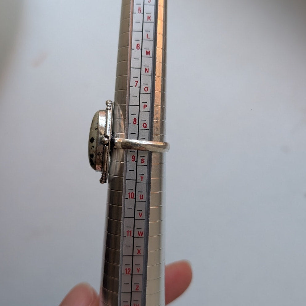 Love!! Gorgeous oval shaped natural stone ring with earthy cream hues and swirly psychedelic spots. Super cute chunky oversize look, distressed cable edge. Witchy minimalist soft girl does femme boho chic vibes. Perfect accessories to complete your fav almost famous penny lane jacket or biker baddie leather looks! Seated in sterling silver plated band, likely not full 925 silver. Excellent quality at a deal! Handcrafted. New without tags.