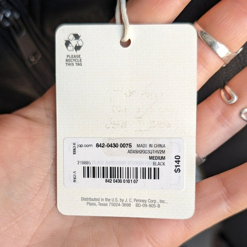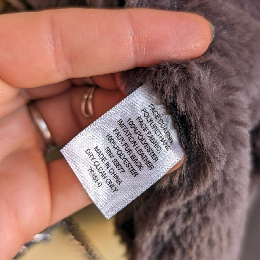 This classic chic jet black faux leather moto bomber is HOT! 80s goth biker baddie does 90s grunge rock and roll girlfriend vibes. Super cozy plush vegan faux fur lining in dark misty gray. Incredibly soft and supple vegan leather shell. Features dramatic, elongated faux fur collar with full front asymmetric zip, side pockets. Penny lane style puff cuffs. Insanely gorgeous! Mid-weight, longline silhouette. New With Tags NWT