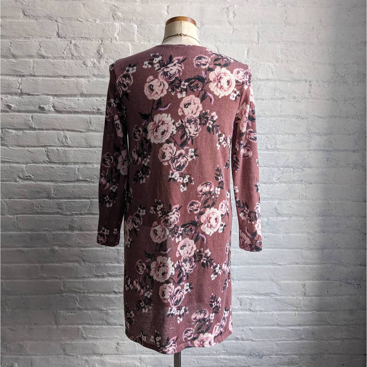 Loving the romantic grunge fairy vibe! Lightweight longline knit cardigan in an ultra 90s femme colorway. Muted dusty pinks on deep rose with gorgeous oversize all over floral rose pattern. Open front fits a range of sizes. Longline silhouette perfect for extra coverage. Minor pilling. Gently used, in very good vintage condition.