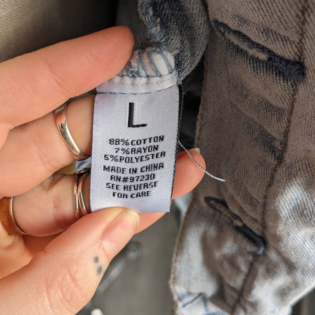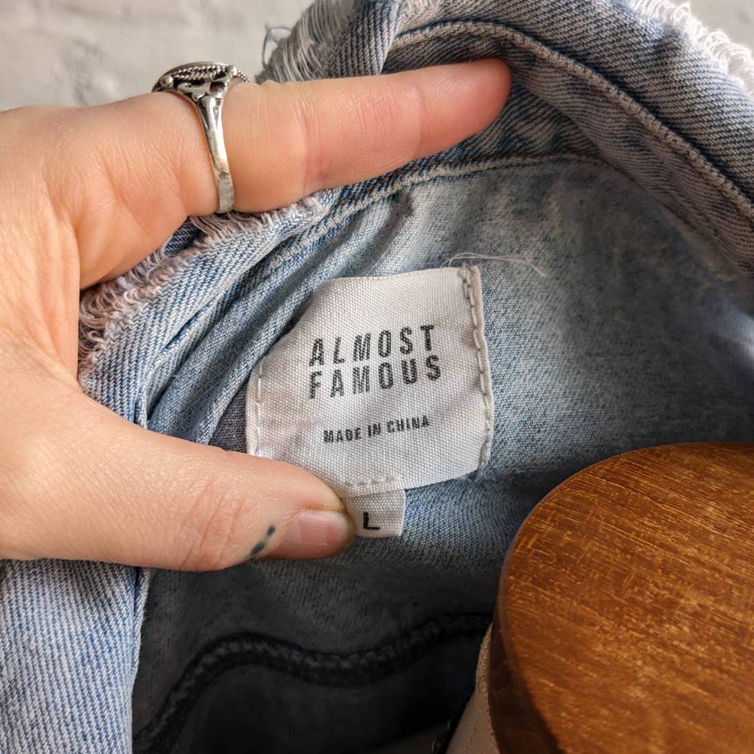 Closet staple! Rad little denim jacket with awesome almost famous thrashed distressed details throughout. Major 90s biker baddie does rock n roll girlfriend vibes. Soft, moveable, light to mid-weight feel in that perfect faded fuzzed out light acid wash. Button front closure, buttoned chest pockets and cuffs. Gently used, in excellent condition.