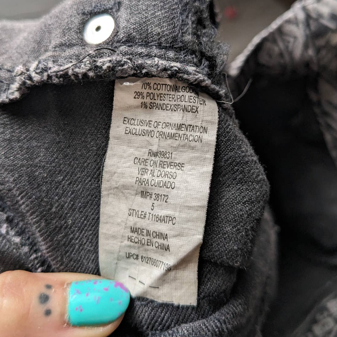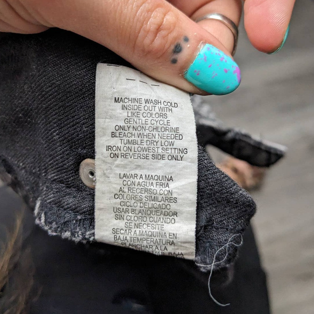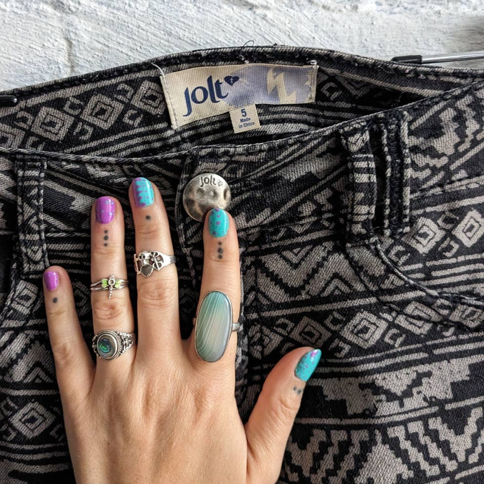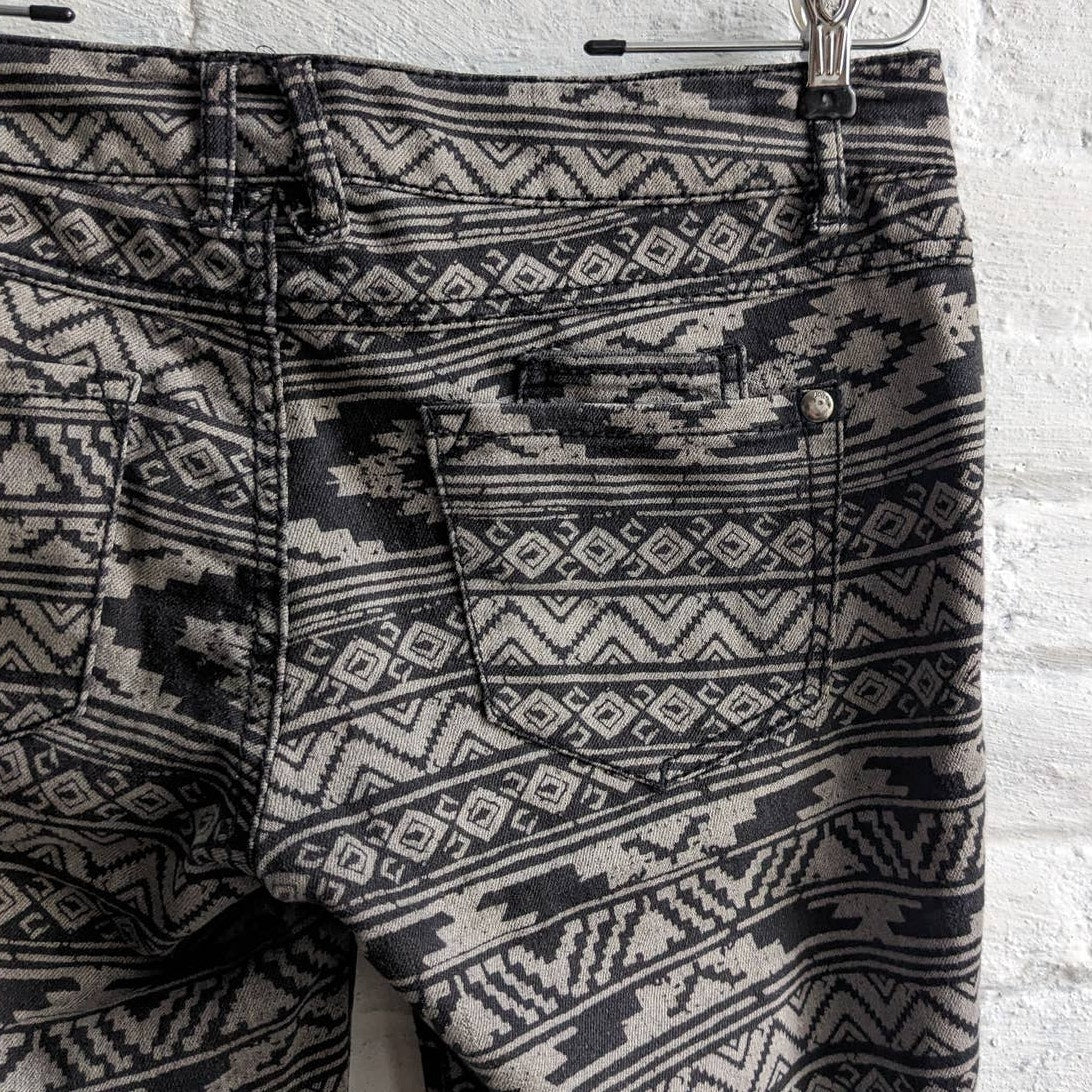 Love! Mega cute and super comfortable mid-rise skinnies in an awesome dark grunge stormy grey. Trippy western psychedelic allover print in faded out muted black. Giving 70s hippie desert girl does 90s grunge biker baddie. Hammered dark silver button closure, zipper fly and five pocket design. Lightweight cotton blend with minimal stretch. Gently used, in very good condition.